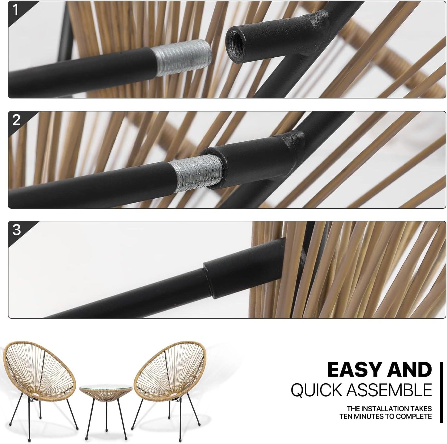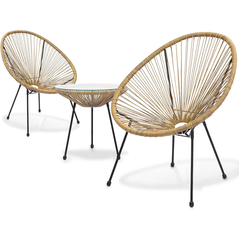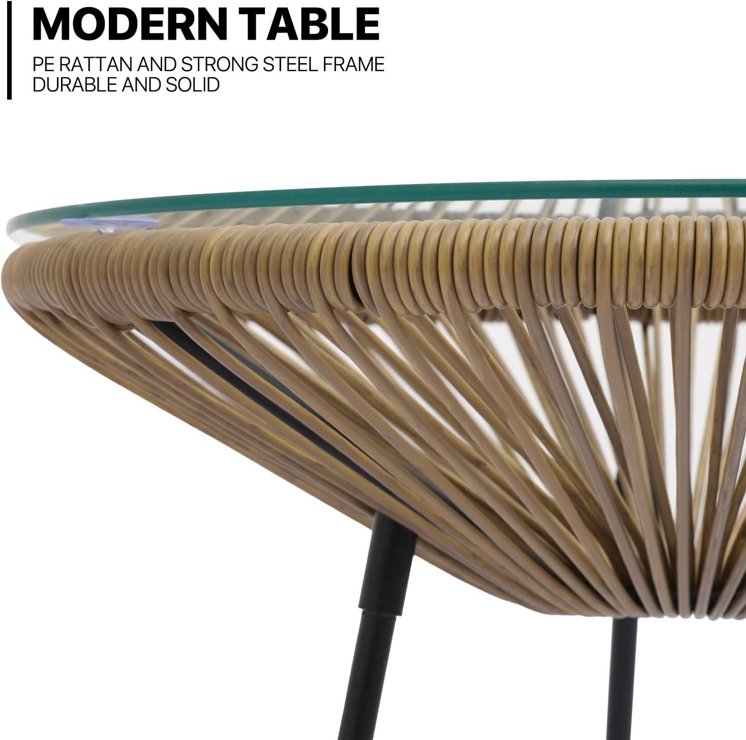 3 Piece Patio Set All Weather Outdoor Furniture Conversation Bistro Set with Plastic Rope, Glass Top Table and 2 Metal Steel Chairs for Garden Deck and Backyard Natural