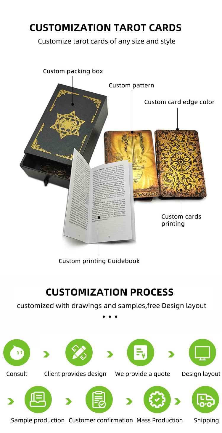 Your custom tarot cards may be complemented with booklets, instructions and