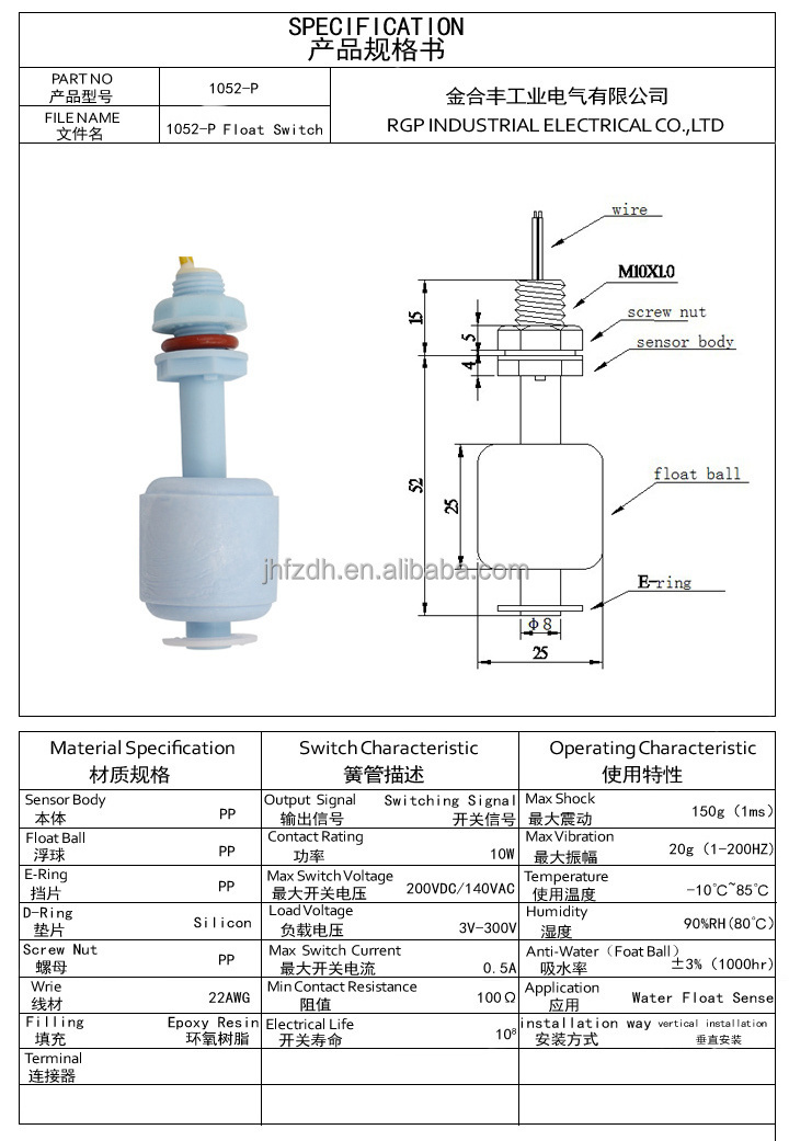 high level float switch, 1052-P Float Switch