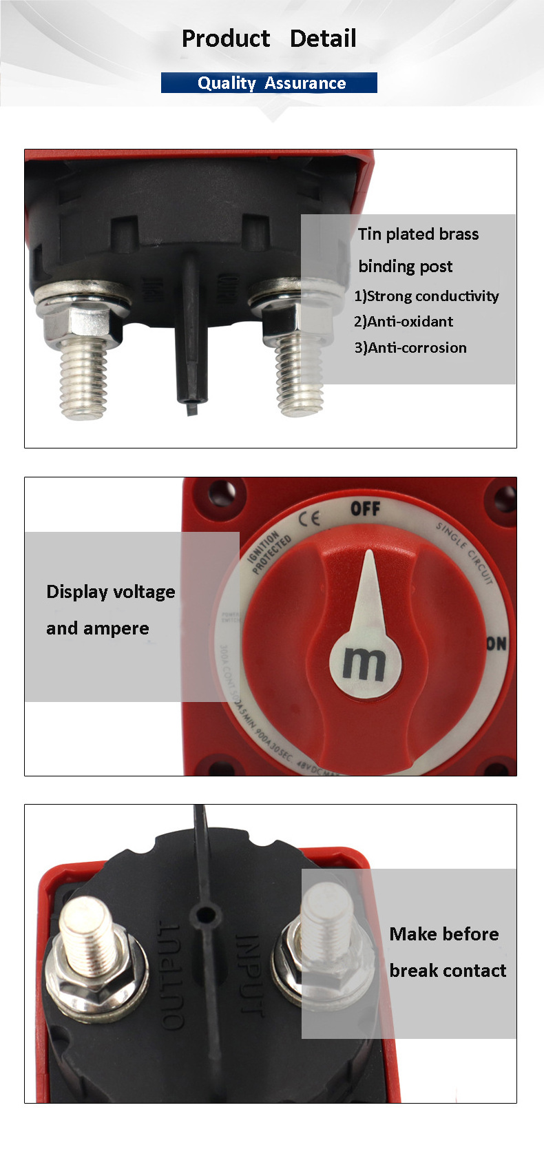 * Tin-plated Copper studs for maximum conductivity and corrosion resistance * 7/8" (22 mm) stud length accepts multiple cable terminals * Blue Sea System's one-piece terminal stud design never loosens over time * Accepts up to 4/0 AWG (120 mm²) battery cables * Tactile indicator conveys knob position by feel * Case design offers multiple mounting options |