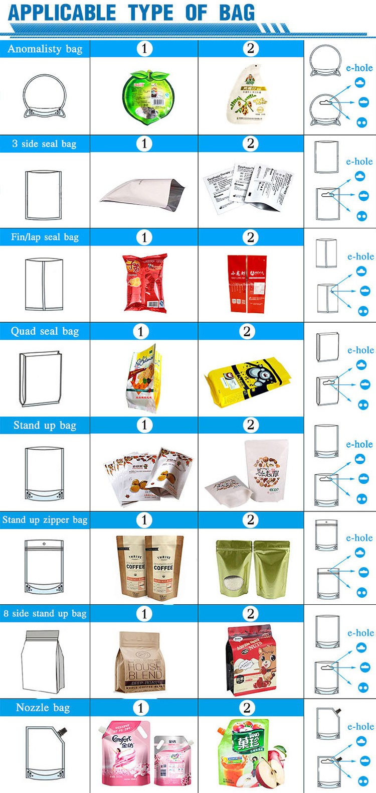 All type of heat sealable performed side seal bags,block bottom bags,zip-lock recloseable bags,stand-up pouch with or without spout,paper bags,etc.