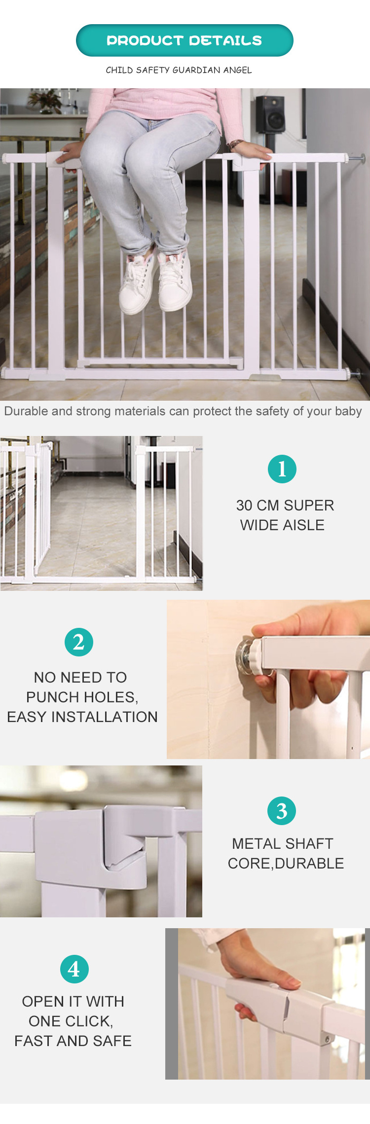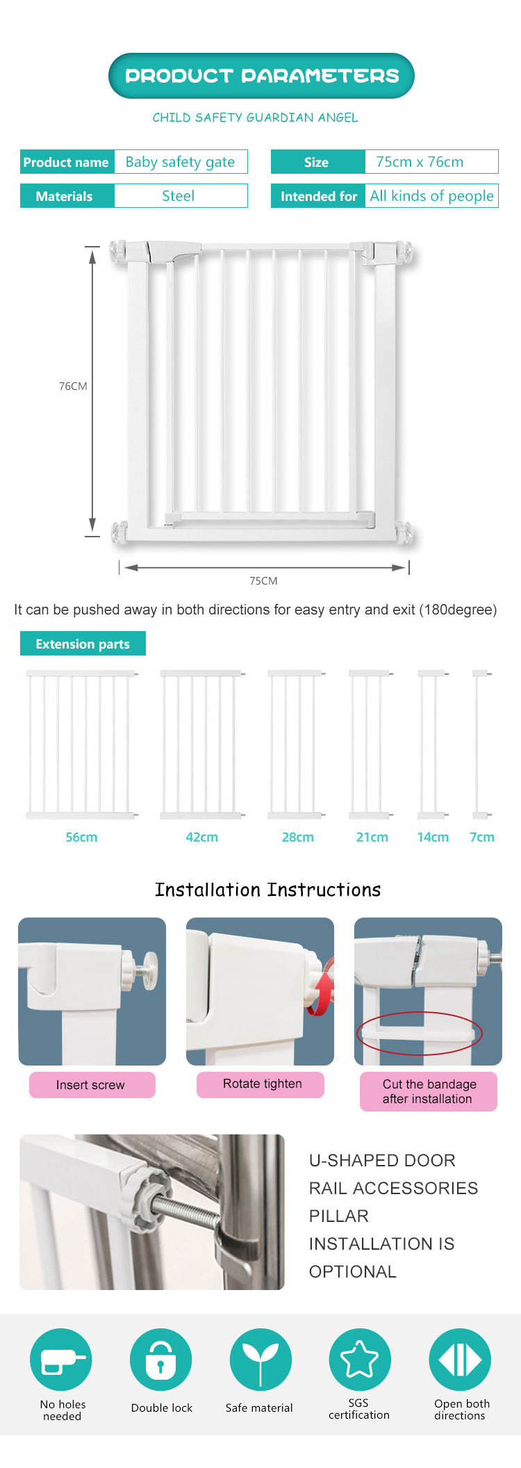 Wholesale multiple color baby and pet baby safety gate durable and strong materials baby steel gate for balcony