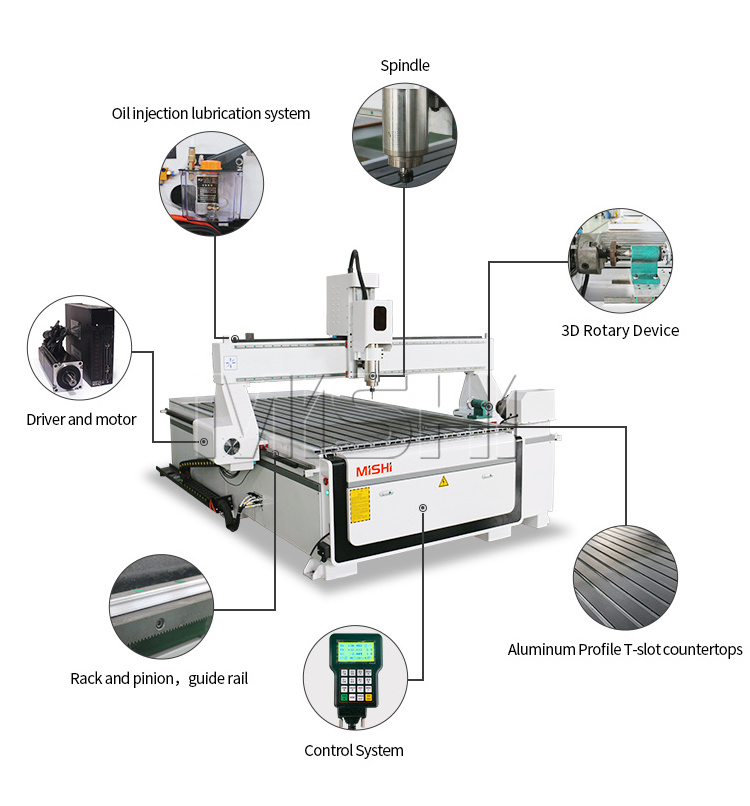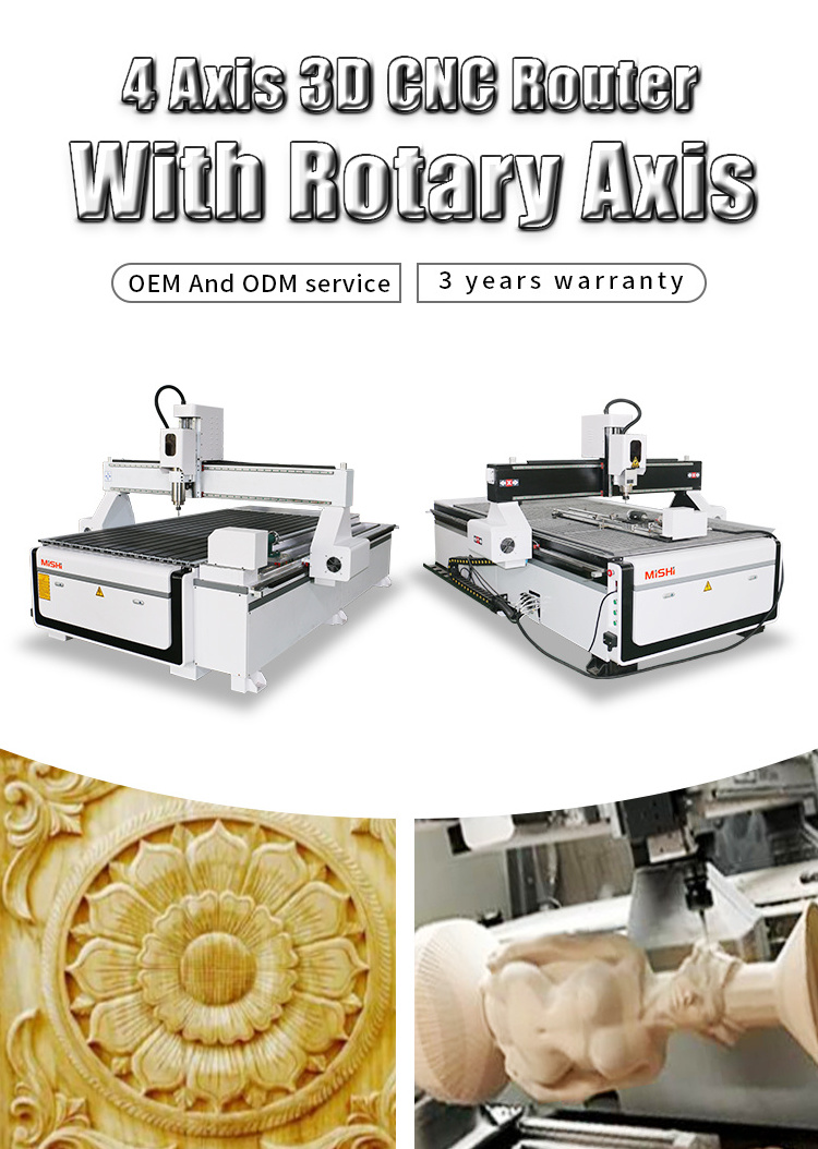 1. The machine uses a four-axis controller, not only able to cut and engrave flat wood, MDF, chipboard, plywood, etc, but also can engrave 3D on round columns, like furniture legs, statues, figures, and so on.