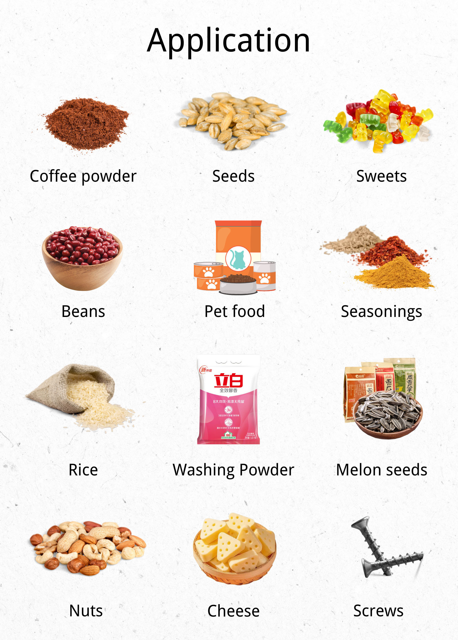 A1:Powder granule filling machine is suitable for various shapes of powder and granule materials, such as flour, sugar powder, coffee powder, sauce, cosmetic powder and so on. It can meet the filling needs of different industries.