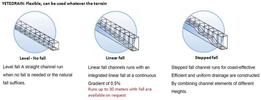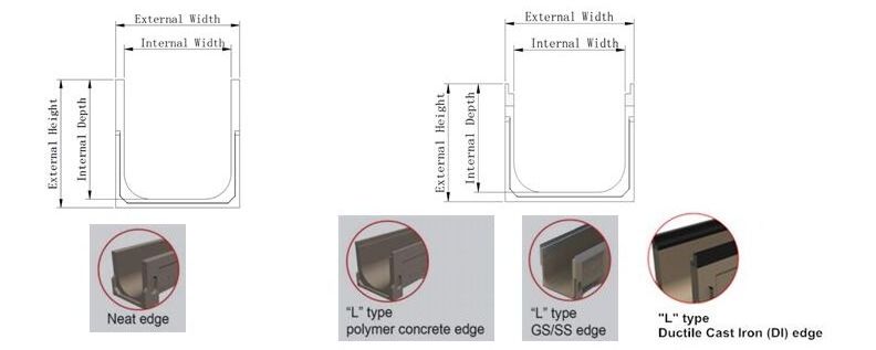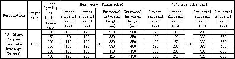2) All our channels are made of polymer concrete, 1000mm long and the CO (internal width) is from 100mm to 400mm with variety external height, comply with EN1433, class from A15 to F900. For the grating material, we usually use Ductile Cast Iron, Stainless Steel and Galvanized Steel.