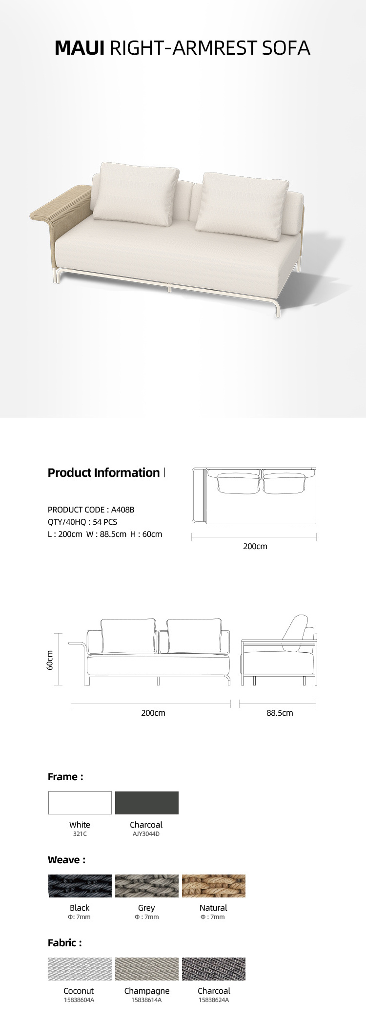 Maui right-armrest sofa:1pc/ctn,43pcs/40GP,54pcs/40HQ;