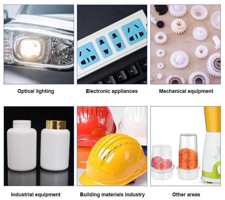 1. Polycarbonate PC granules is made into large bulb shade, protective glass, the right and left eyepiece tube of optical instruments. Also, it is used the transparent materials in plane.