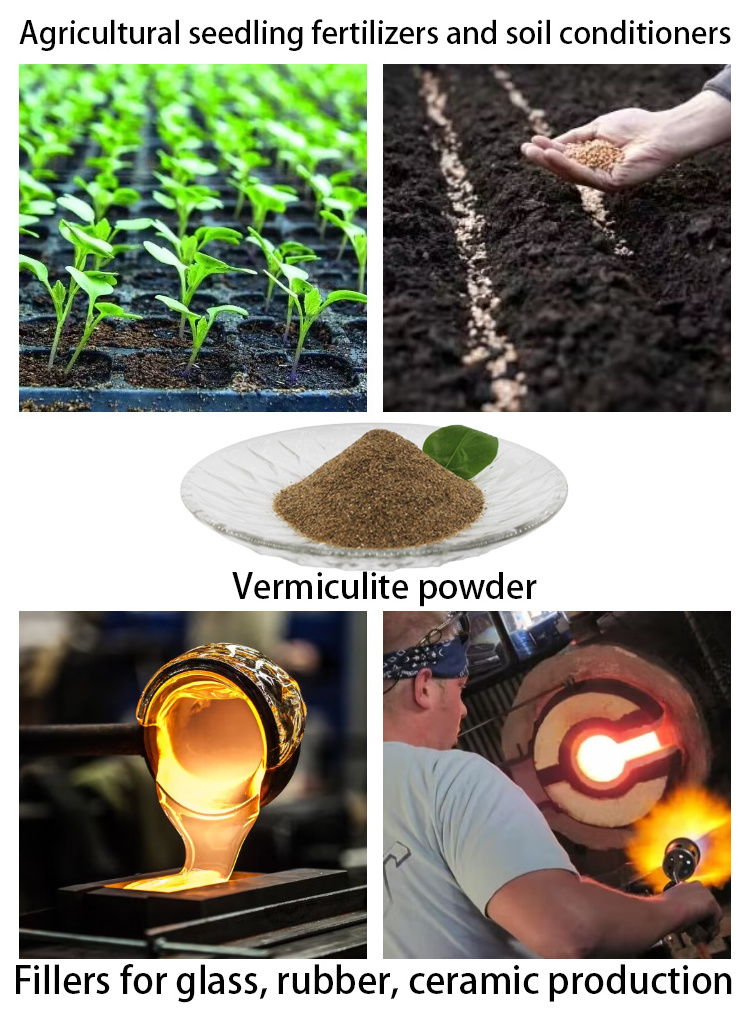 Vermiculite is a mineraloid of hydrated laminar magnesium-aluminum-ironsilicate. Its chemical composition greatly varies and chemical formation could be simplified as ( Mg.Fe..Fe.. )3[(SiA)4O10][OH]24H2O. When heated to a temperature of about 850-950℃, it instantly expands (exfoliates) up to 15-25 times as water flashing into steam, maximum 30 times its original bulk volume. There is a color change during expansion from golden brown into silver white depending upon the composition of the vermiculite and temperature. With such prominent characteristics as being fireproof, heat insulating, sound and moisture absorbing, non-toxic, lightweight and disease free, it is widely used in construction, chemical industry, petroleum, electronics, light industry, environmental protection and as medium of agricultural chemical products etc.