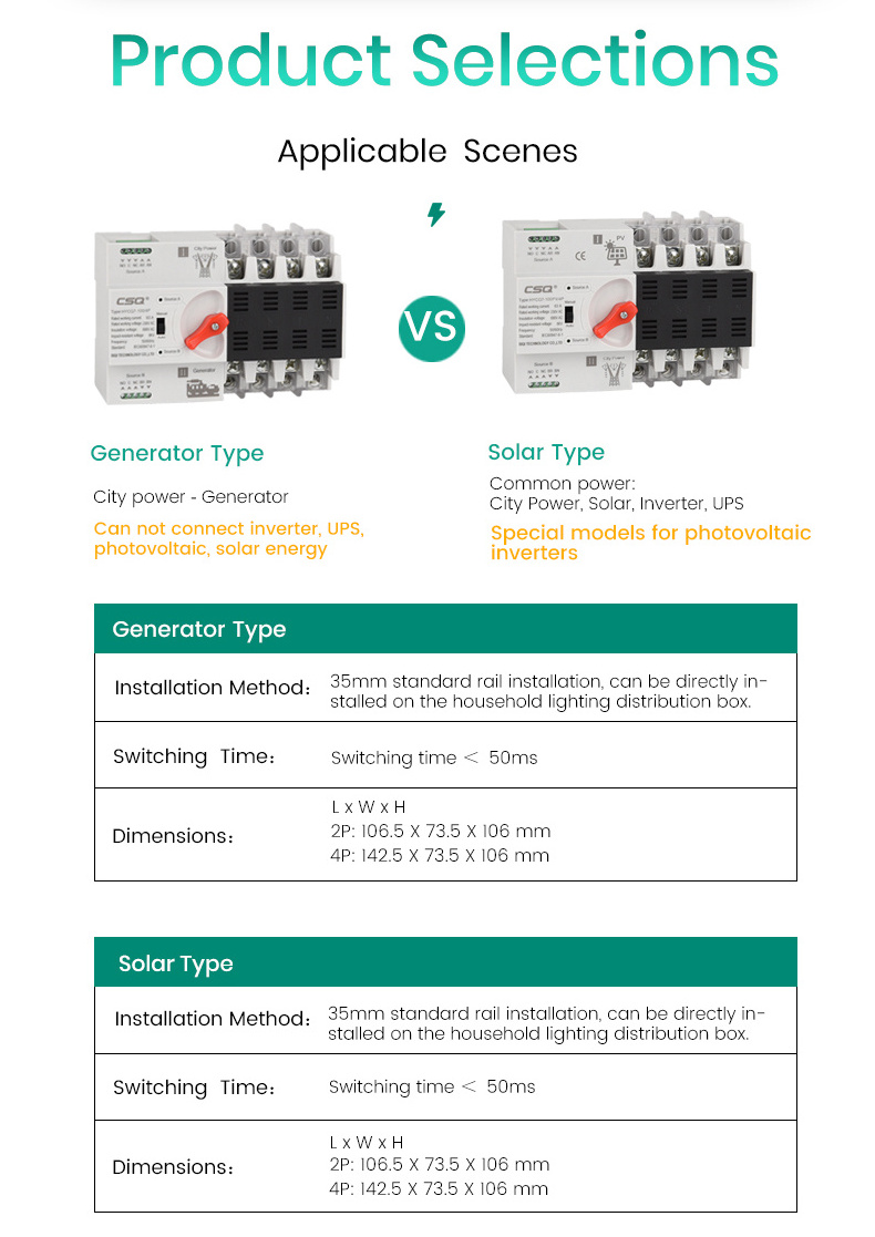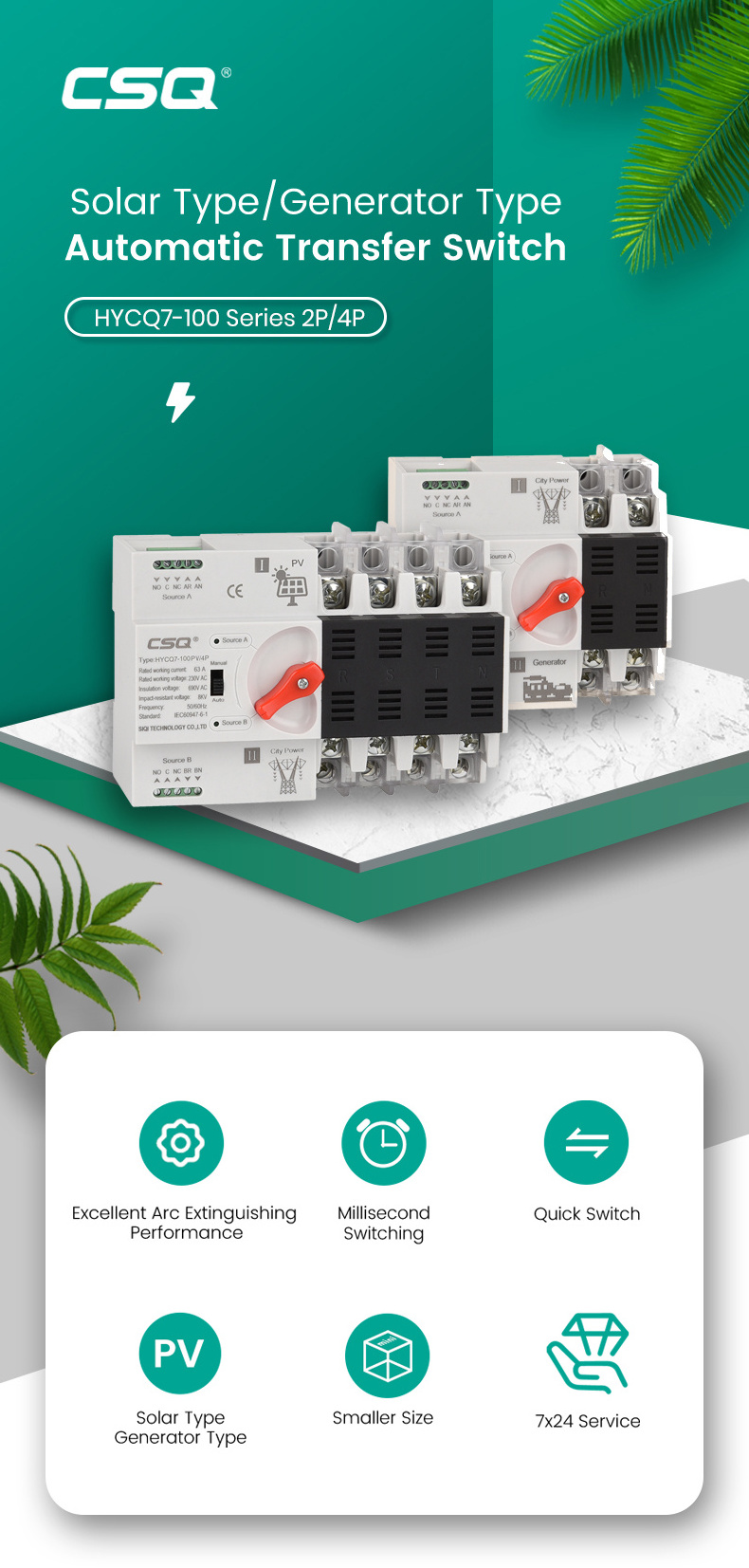 HYCQ7-100 series new design automatic transfer switches are new developed micro household power transfer switch.. The switch is mainly used for testing whether normal or spare power is normal or not. When the normal power is abnormal, the spare power works at once, which therefore ensures the continuirty, reliability, and safety of power supply. The product is specially designed for household orbit-type installation and specially use in PZ30 power distribution box.