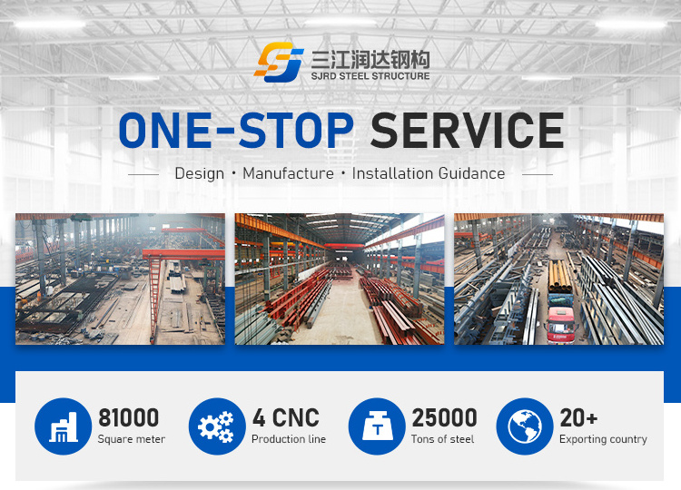 Qingdao Sanjiangrunda Steel Construction Company Limited is a professional enterprise engaged in steel structure design, research and development, manufacturing, installation and sales. The company's main products are all kinds of steel structure warehouse,multi-storey and high-rising steel structure building, container house, prefabricated house and so on.8 1, 00 0 square meter construction area, with four advanced CN C steel structure processing line, the workshop could produce various light and heavy industrial building, civil building, shopping mall, exhibition hall, stadium and other large steel buildings. The four production lines could process 25,00 0 tons of steel, equal to 3 60, 000 square meters steel structure buildings every year.