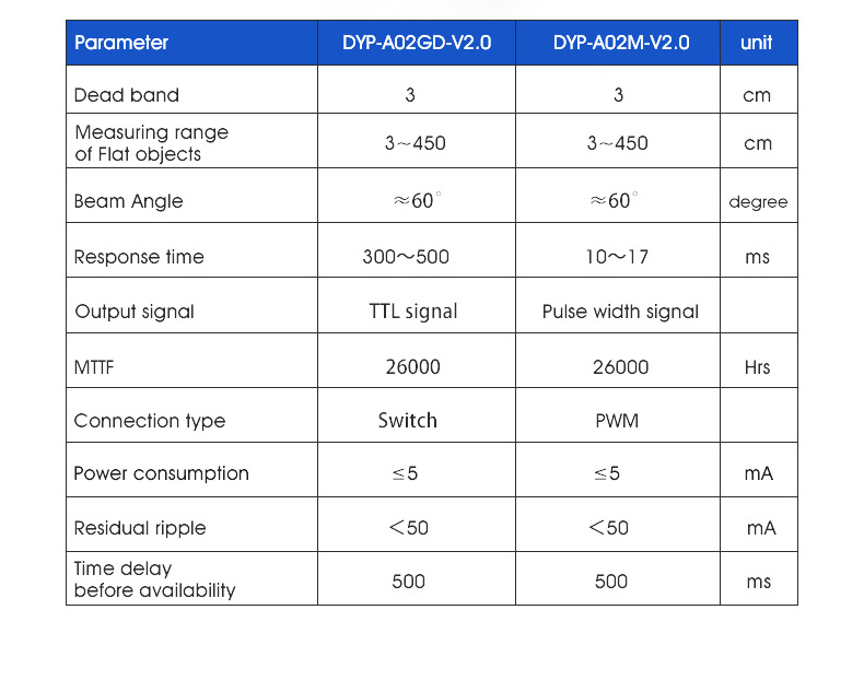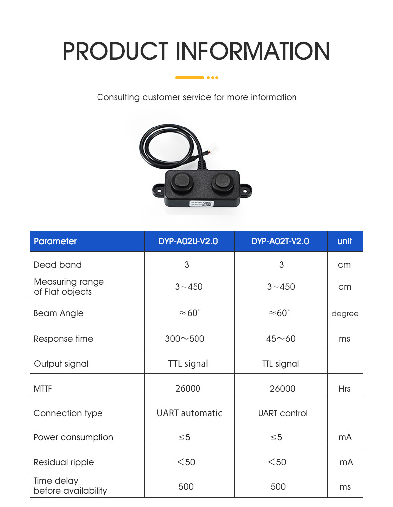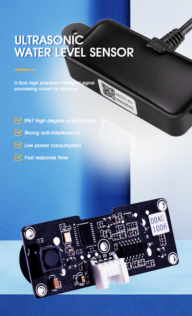 (2) Multiple output modes. (3) Waterproof sensor. (4) Strong anti-interference, anti-static abilities. (5) Data output stable and reliable. (6) Tiny size, easy to install. (7) Long measurement range, high accuracy. (8) Automatic output mode, not occupy hardware resources. (9) Controlled output mode, low power consumption |
