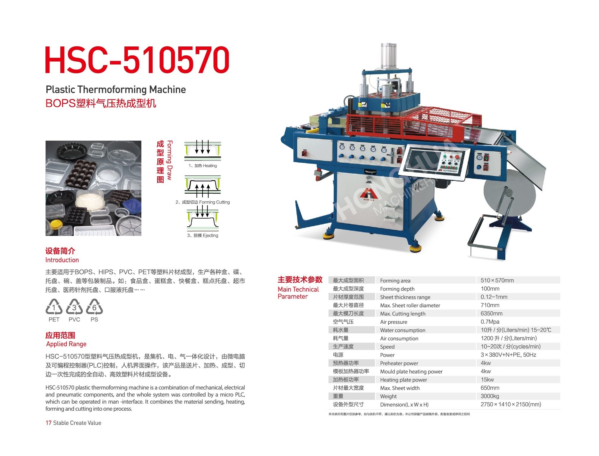 It is suitable to form BOPS,HIPS,PS,PVC,PET sheet that can produce boxes,trays,fast-food boxes,dishes and lids etc.