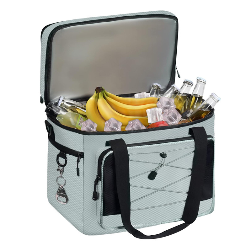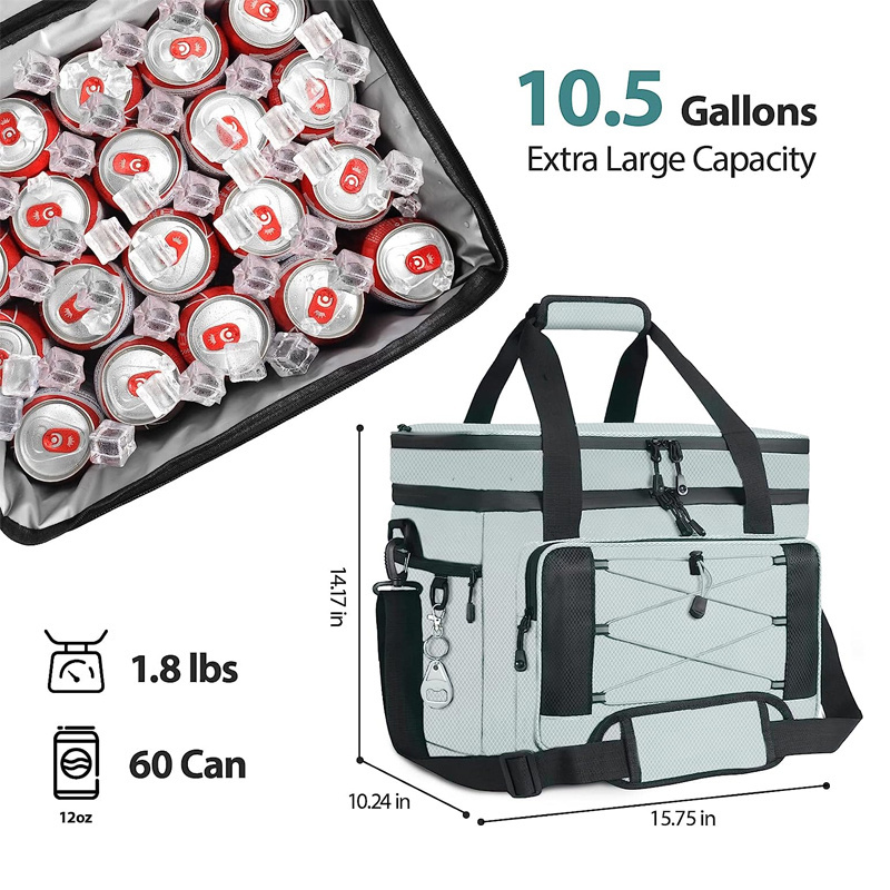 Extra-large size yet weighs only 1.8 lbs. The Soft sided cooler will hold up to 60 cans of your favorite drinks plus 2-4 ice-packs. Or, with 45 cans you can add 15 lbs. of ice for long lasting coldness. Whether it's camping, hiking, picnicking, or a BBQ party, this cooler bag easily packs a lot of food, fruits, beer, meat, or even seafood together. It’s large enough to carry all.