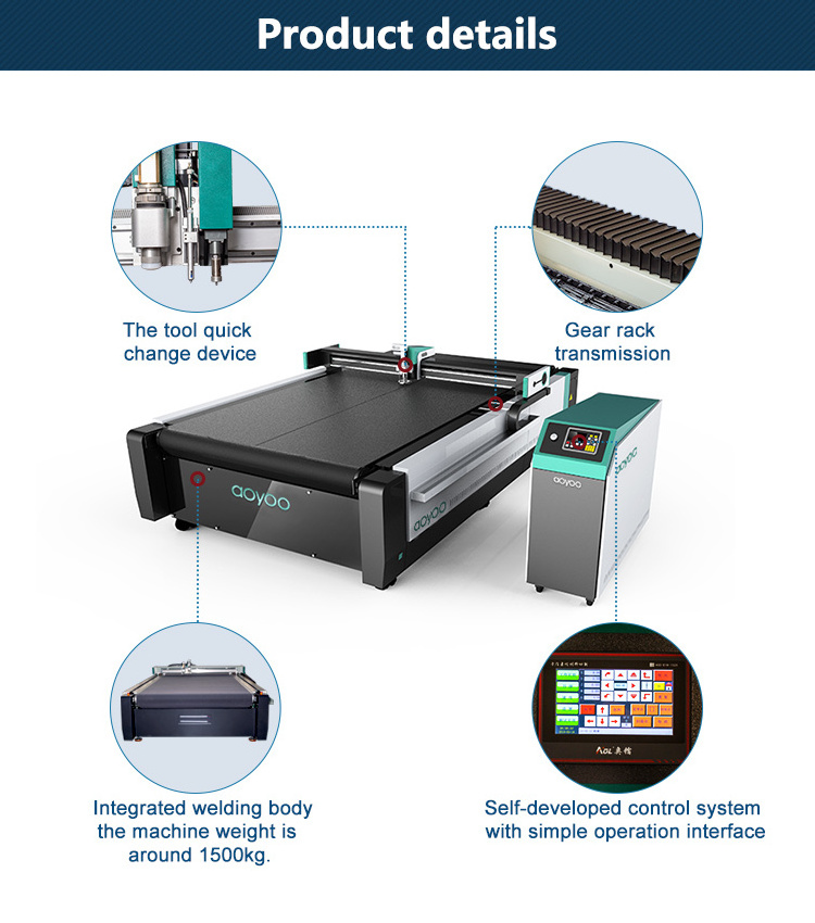 Our main products include intelligent digital cutting machine and flexible material intelligent cutting machine,cloth and lether cutting machine,high-tech composite cutting machine.Aoyoo CNC knife cutting machine is widely used in