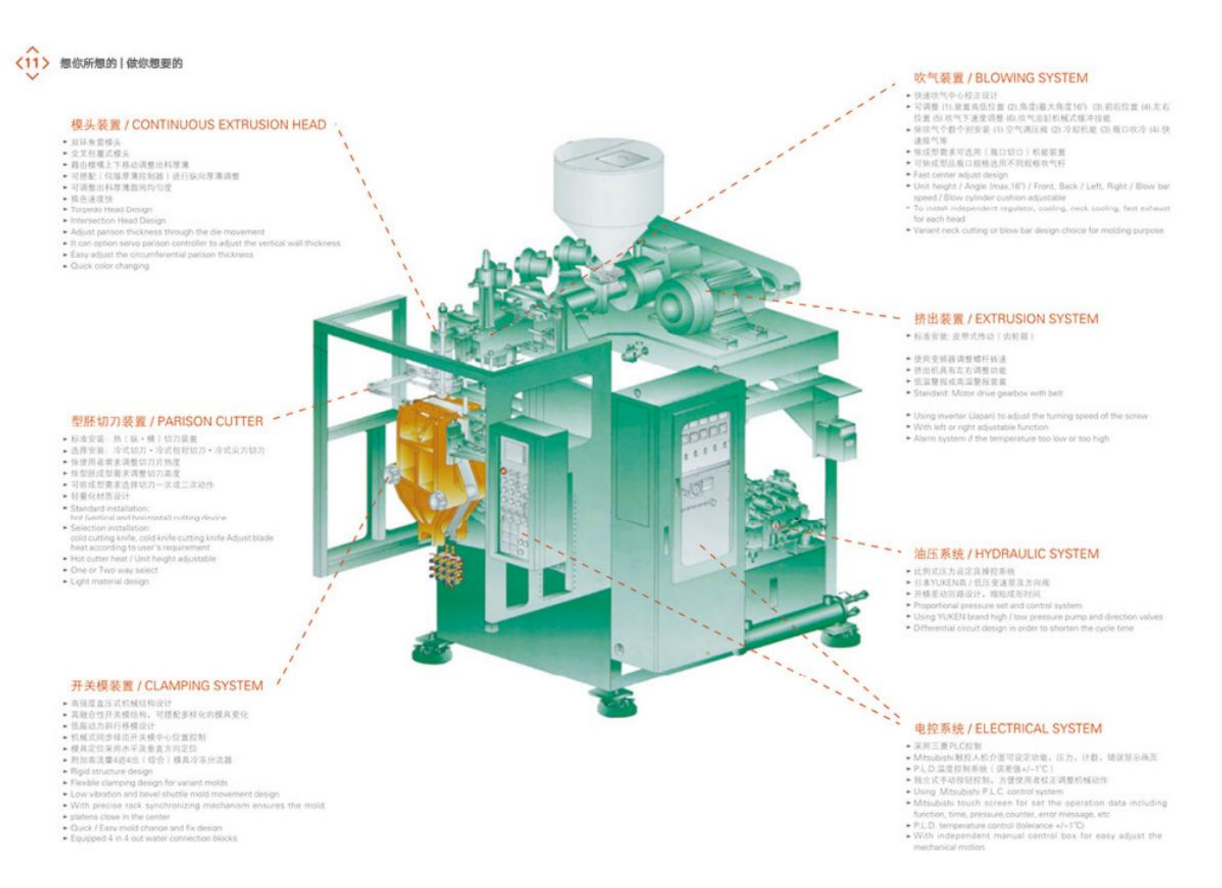 Extrusion blow molding machine is widely used to produce all kinds of the hollow plastic containers for foods, toys, beverages, medicines, chemical products, detergents, water bottles, milk bottles, oil bottles, plastic balls, cosmetic bottles, lubricant bottles, plastic containers. The machines are low investment, high efficiency, quick and safe operation, easy for trouble shooting, maintenance and other benefit. We help you on marketing research, products selection and factory layout, ensure your investment with a big profit feedback. We are the professional end supplier in blow molding field, supporting you from new project consultation stage to after sales service. We are your professional blow-molding working team and partner, would help our customer grow up and get win-win benefit together.