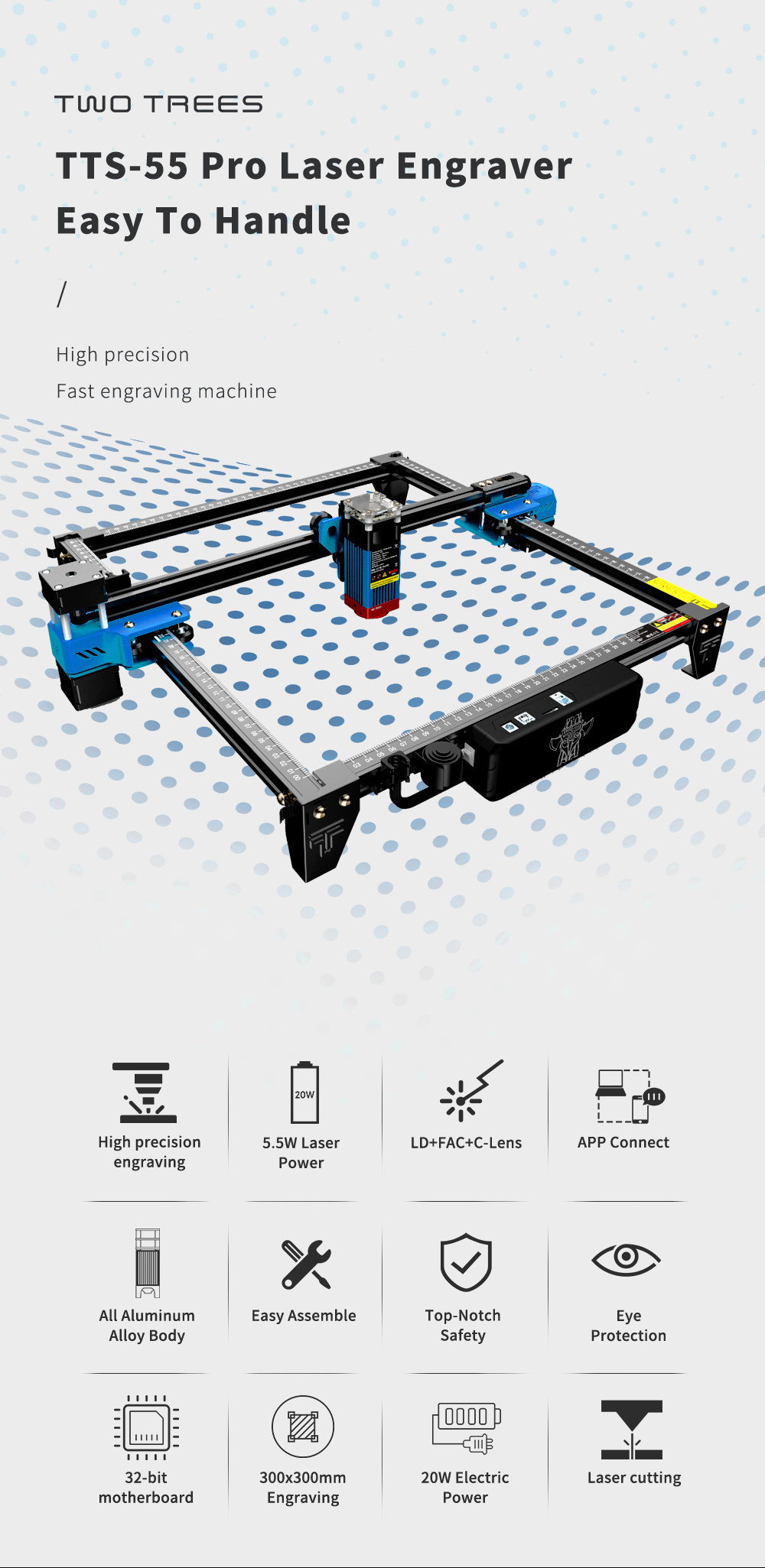New Upgrades: Twotrees TTS-55 is an upgraded version of TT-5.5S. TTS-55 aluminum profile added digital scale, upgraded to32-bit motherboard. Add power switch to motherboard. Magnetic laser protection covers, CNC Z-axis lifting devices, Cable management using bellows, Multi-grade metal positioning posts, etc.
