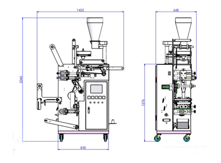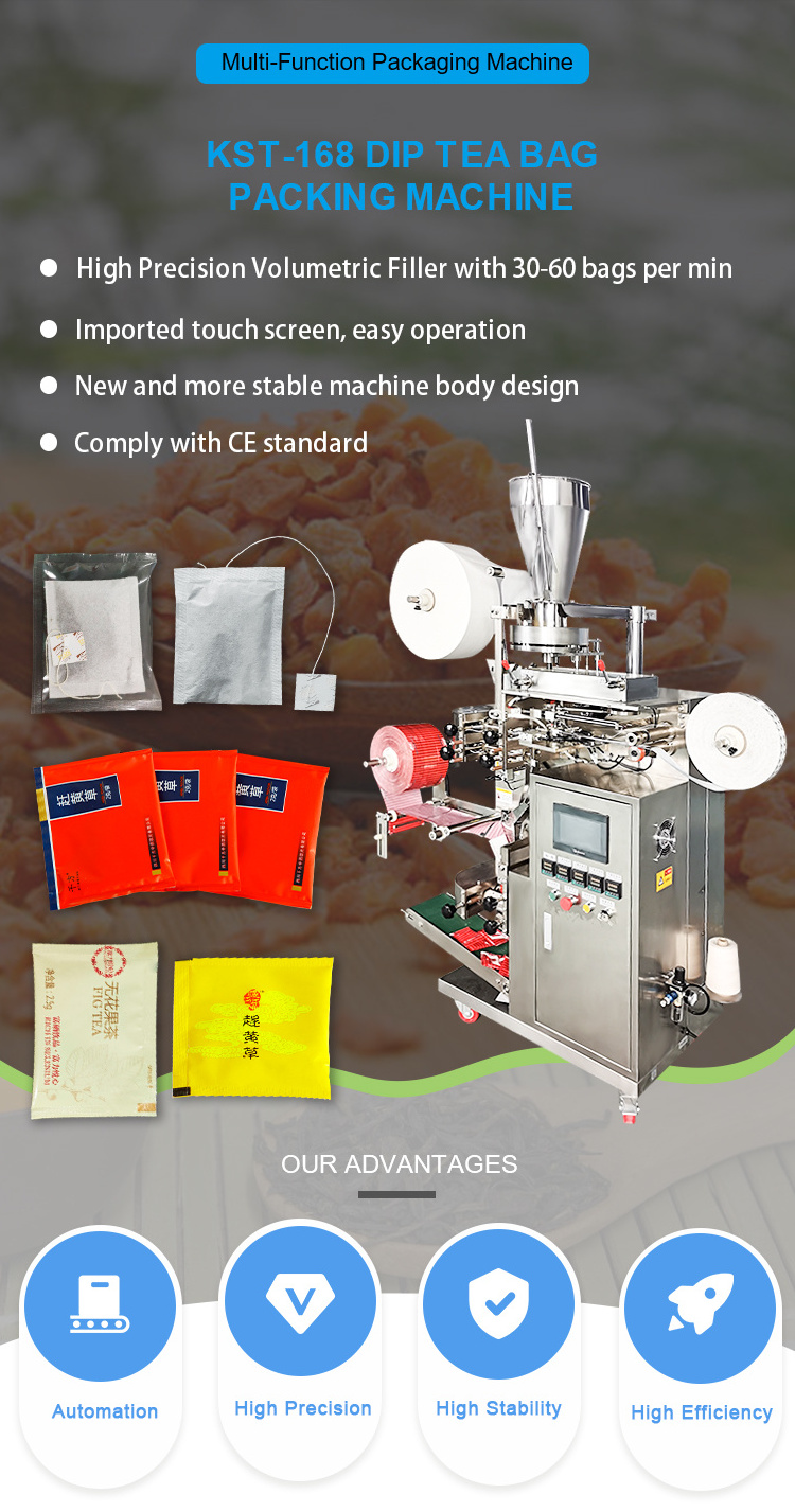 KST-168, the small tea bag packing machine, specially design for filter paper dip tea bag packing, adopts the VOULUME CUP filling and Weighing system, HMI control, easy operation. It is widely used in different kinds of tea and little granule packing, the accuracy can arrives at ± 0.2 grams/bag.