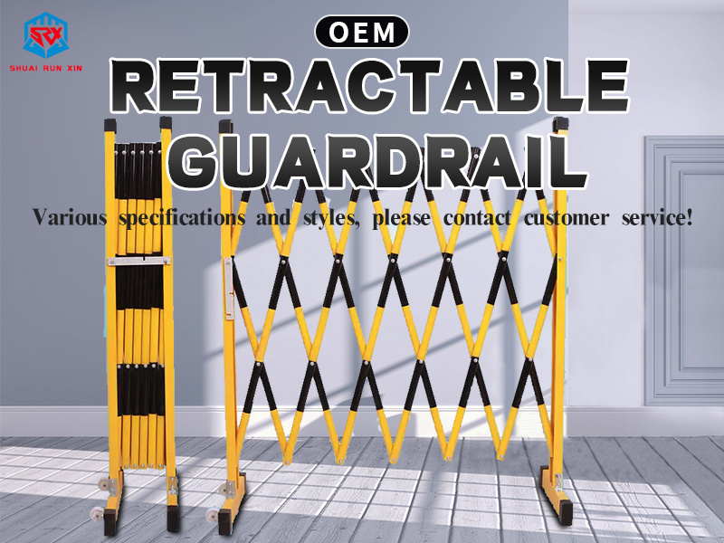 The retractable safety fence is a retractable safety fence, which is composed of a retractable isolation belt and a base. The retractable isolation belt is composed of a isolation belt, a rotating shaft, a reed and an external protective sleeve. The retractable isolation belt is connected with the base. The base is a magnetic base, and the base is provided with a suction surface. The retractable safety fence is fixed to the object through the magnetic suction of the base and the object surface, The magnetic base is provided with a switch which can open and close the base magnetism.