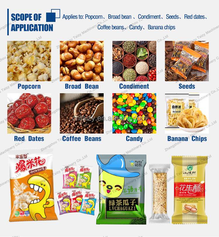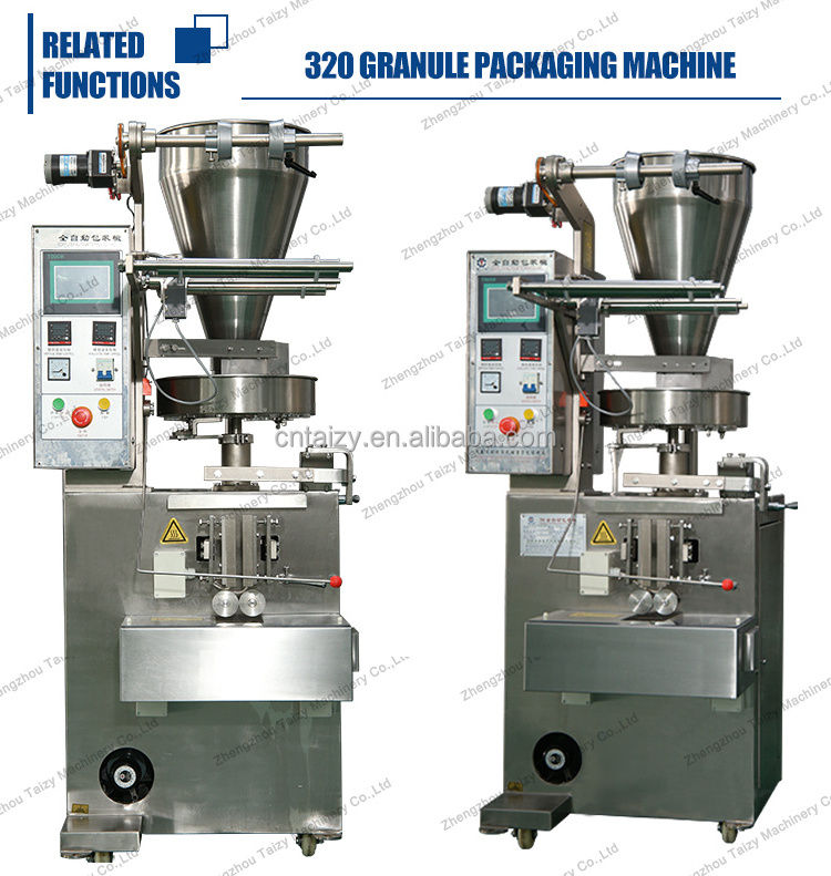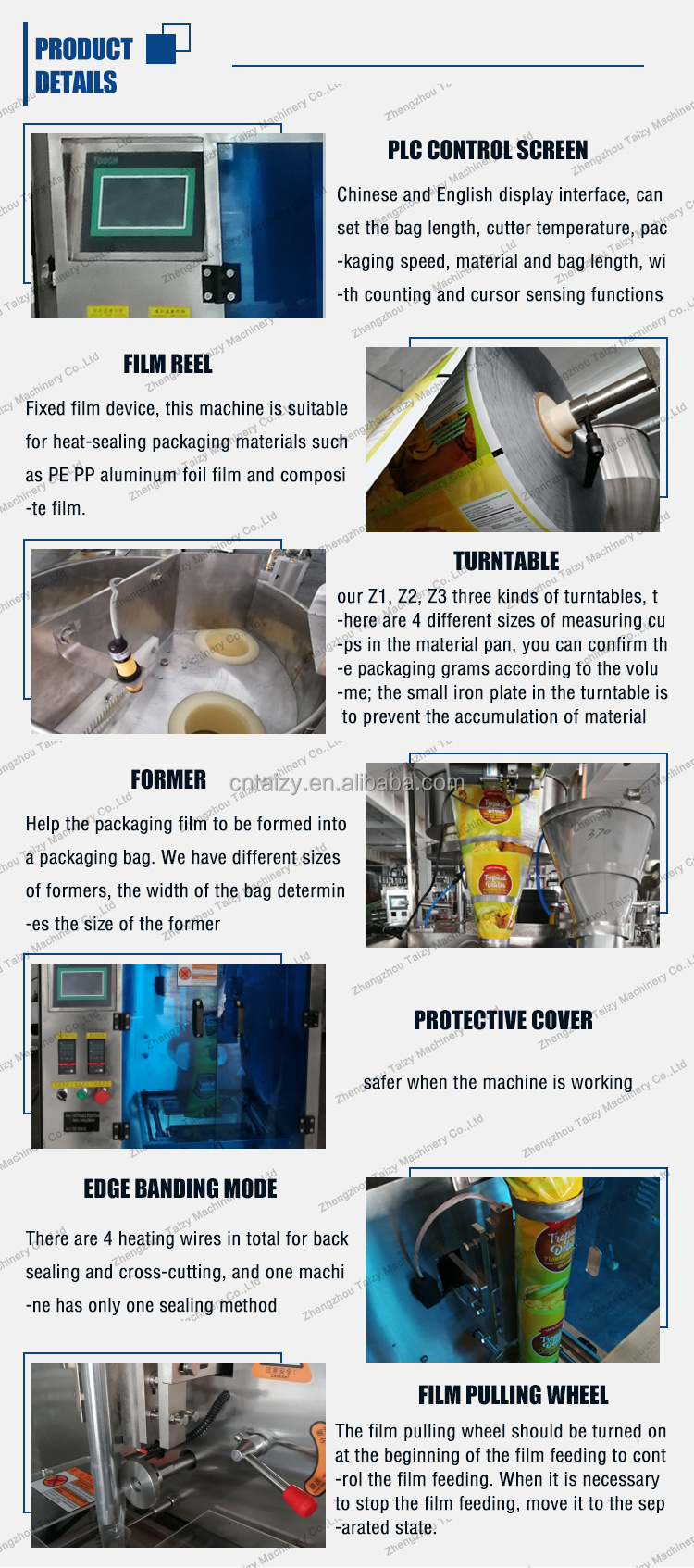 Hopper, turntable, bag former, vertical seal, horizental seal with cutter, PLC , film reel.