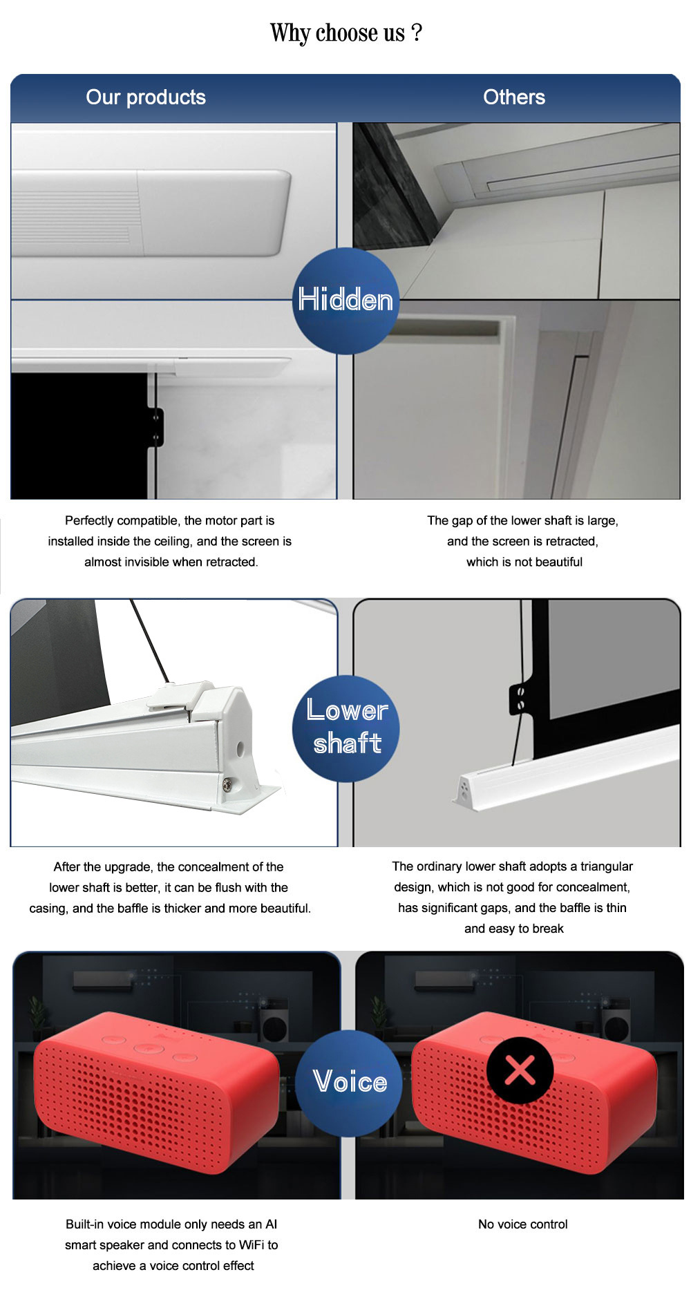 Silent Operation: Our motorized lifting system incorporates silent technology, operating with minimal noise, ensuring an undisturbed viewing experience and uninterrupted conference discussions.