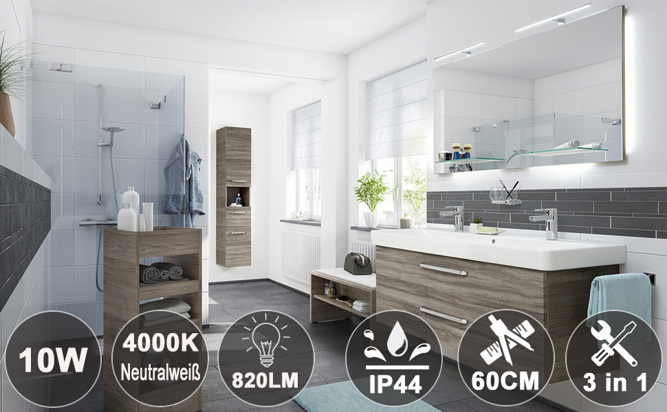 LED Mirror Light 10 W 820 lm Bathroom Mirror Lamp 4000 K Neutral White 60 cm IP44 Waterproof Lamp Made of Stainless Steel and Plastic