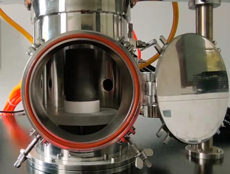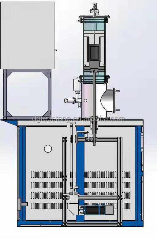 The lower stainless steel flange is welded with a vacuum chamber, and a furnace door is opened on the vacuum chamber. Materials can be taken from the furnace door. The chamber is welded with KF25 connector, KF16 interface, and intake valve. A vacuum baffle valve is installed on the KF25 connector, and a 1-meter long corrugated pipe is connected to the valve and vacuum pump. The KF16 interface can be connected to a vacuum gauge