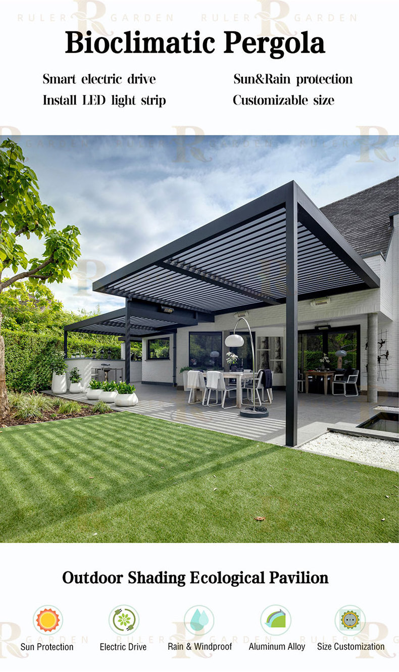 Bioclimatic pergola is a kind of architectureal art made of all-aluminum, which fits the transformation of various forms, when the blades are open, sunlight are breeze can enter from the specified angle; when the blades are closed, the sunlight are rainwater are completely blocked, and the rainwater can flow along the established drainage groove. The material can withstand harsh weather and environment, which is durable and can last for 20 years. Combined with different facade packages, a perfect outdoor leisure space is created.