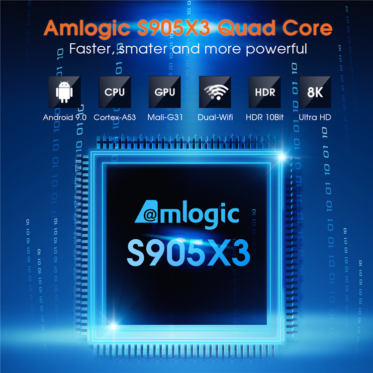 Amlogic S905X3 64-bit quad core ARM Cor- tex A55 CPU