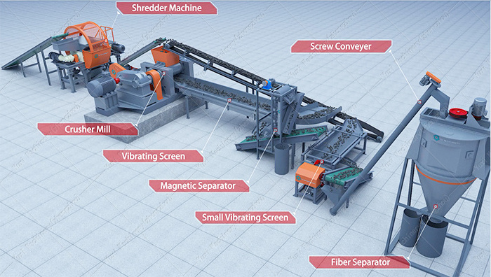 Cut off tyre steel bead----cut tyre body into strips ----cut the strips into 50*50mm-----crush into 5mm-----separate steel wire------separate fiber----pure rubber granules (5-6mm)