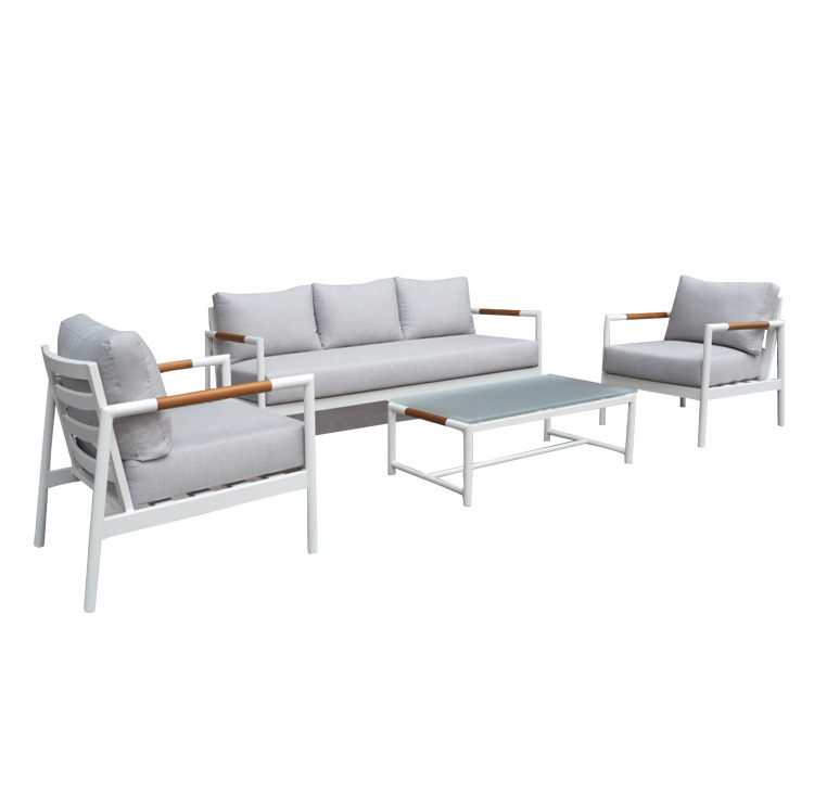 1*3S Sofa With Armrest + 2*1S Sofa With Armrest + 1*Table+ 3* cushions + 5*pillows (Sofa: 2.00mm high temperature outdoor special spray paint,Aluminium alloy frame with teak inside armrest ,and 10 cm thick water-proof fabric cushion. table: aluminium alloy with Outdoor special spray paint,tempered glass table top )