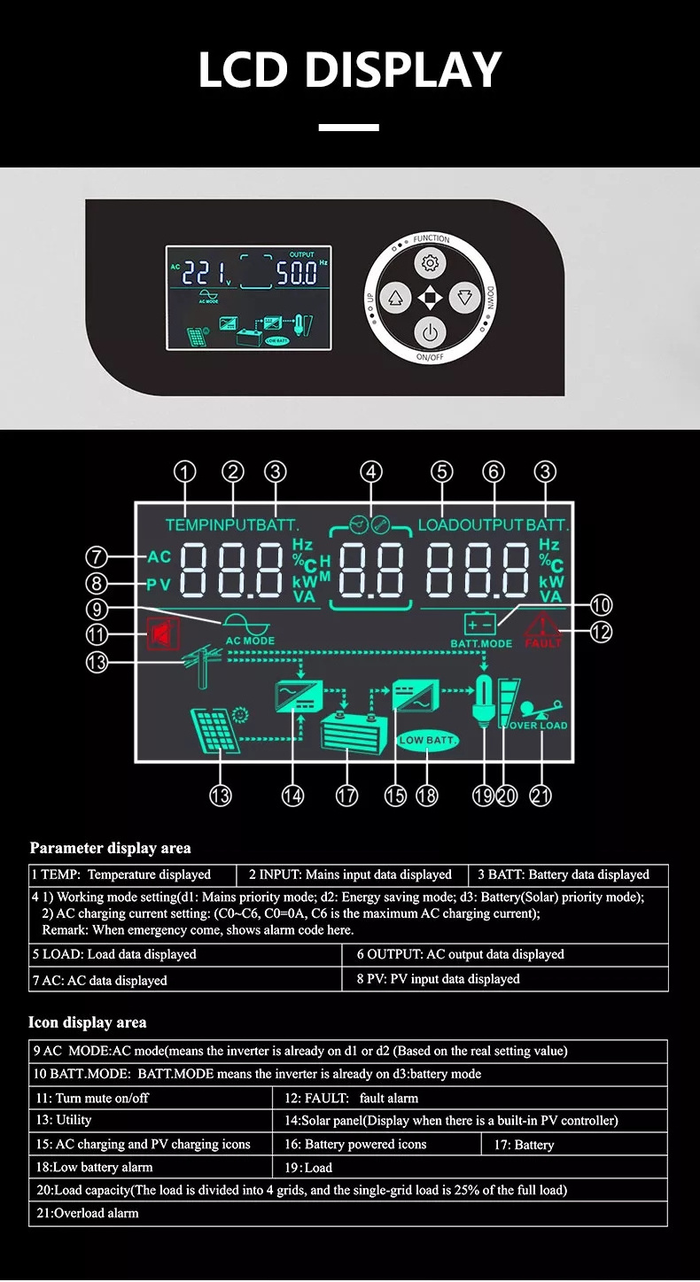 5. AC charge current 0-30A adjustable; battery capacity configuration more flexible;