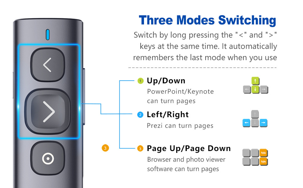 Different applications require different hotkeys to turn pages. User can press and hold the "<" and ">" keys 1 second at the same time. This allows the presenter to switch to one of 3 modes. By default, the functions of "<" and ">" keys are Up and Down. They work for PowerPoint and Keynote. After the first switch, their functions are Right and Left. They work well for Prezi. After the second switch, their functions are the Page up and Page down. They work for web browsers and graphic viewers. After the third switch, their functions turn back to the Right and Left. The presenter will remember your setting for your next use.