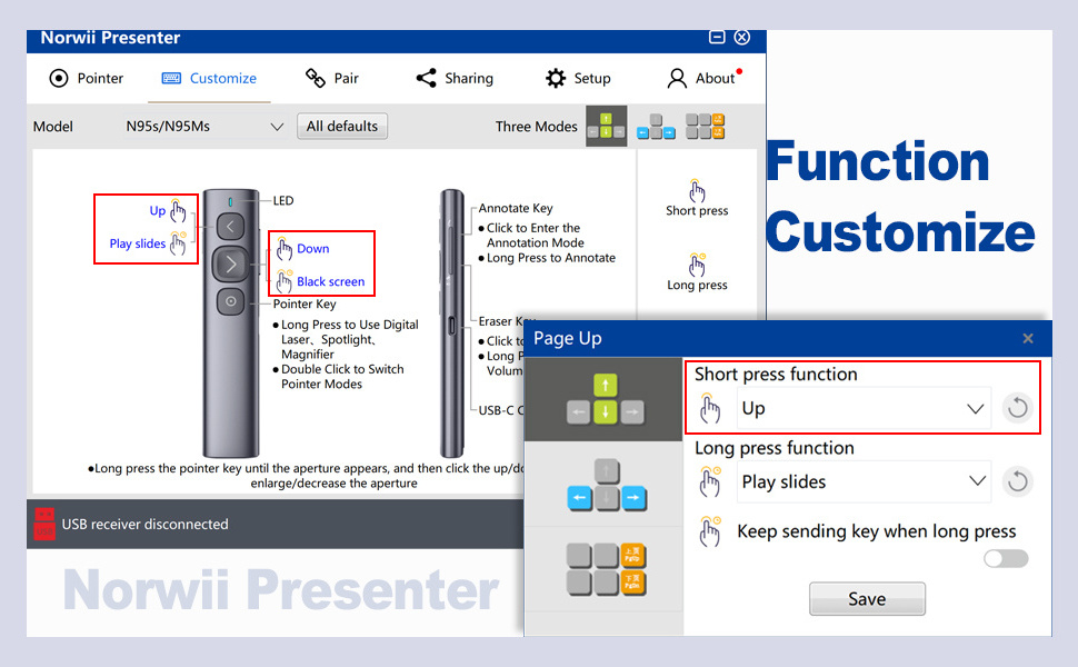 Function customization allows the user to set a hotkey for each individual key of the presenter.