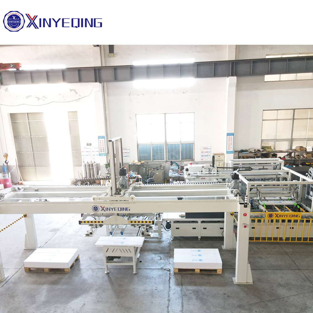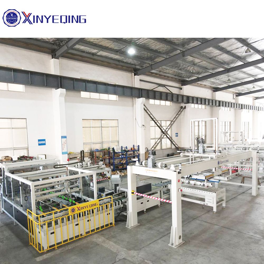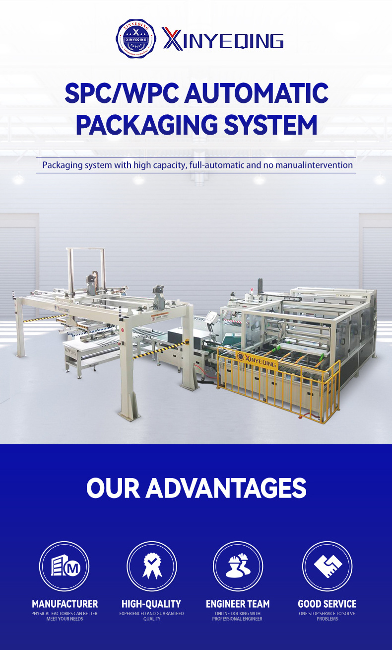 The R-series high speed LVT/WPC/SPC hot melt glue automatic packing machine which was produced bu suzhou xinyeqing ltd .Its use PLC intelligent modules control system and precision sprocket chuck drive mechanism.Cooper with hot melt glue machine and high precision spray gun ,through intermittent spraying function to achieve 8-10 packages per minute speed. Directly connect with slotting machine and film laminating machine .Meanwhile, it can set a variety packing sizes on one machine .convenient adjustment ,easy operation .The floor automatic packing palletizer can be use alone ,also can be used with the silence pad laminer and slotted machine .Its was flexibly used according to production requirements.