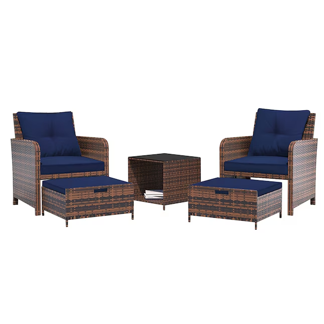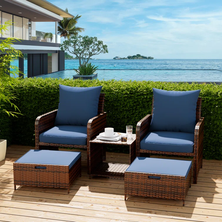 containing 2 single chairs (cushions included), 2-foot ottomans (pillows included), and 1 coffee table. The patio bistro sets