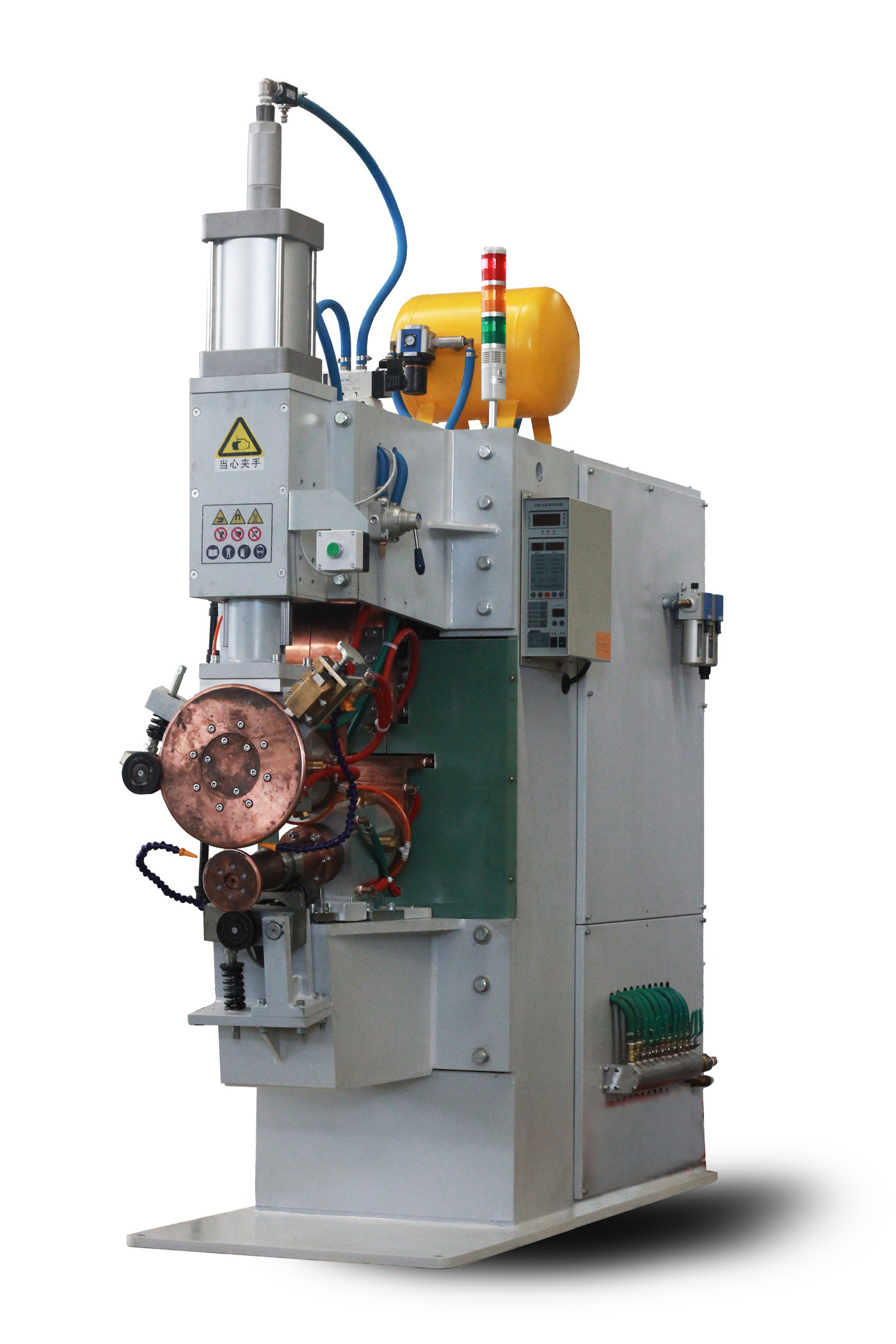 Seam welding machine is composed of main body, workpiece positioning mechanism, workpiece pressing mechanism, welding wheel longitudinal running mechanism, cooling system, welding power supply, pneumatic system and electrical control system.