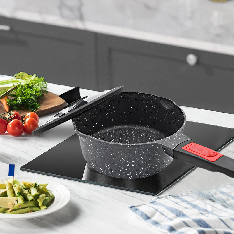 Food grade silicone, healthy and safe lid. Completed with a tempered glass lid, designed with a steam vent and utensil storage,
