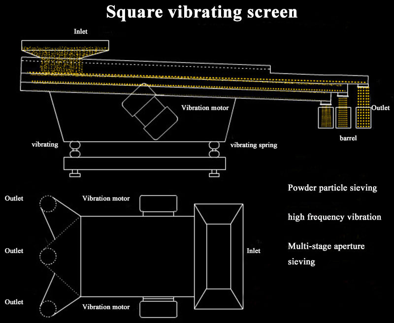 The thermal vibrating screen is a high-precision fine powder screening machine with low noise and high efficiency. It takes 3-5 minutes to change the screen quickly. The rotary vibrating screen uses a vertical motor as the excitation source. The upper and lower ends of the motor are installed with eccentric weights, which convert the rotary motion of the motor into three-dimensional motion of horizontal, vertical and inclined, and then transmit this motion to the screen surface. . Adjusting the phase angle of the upper and lower ends can change the movement track of the material on the screen surface.