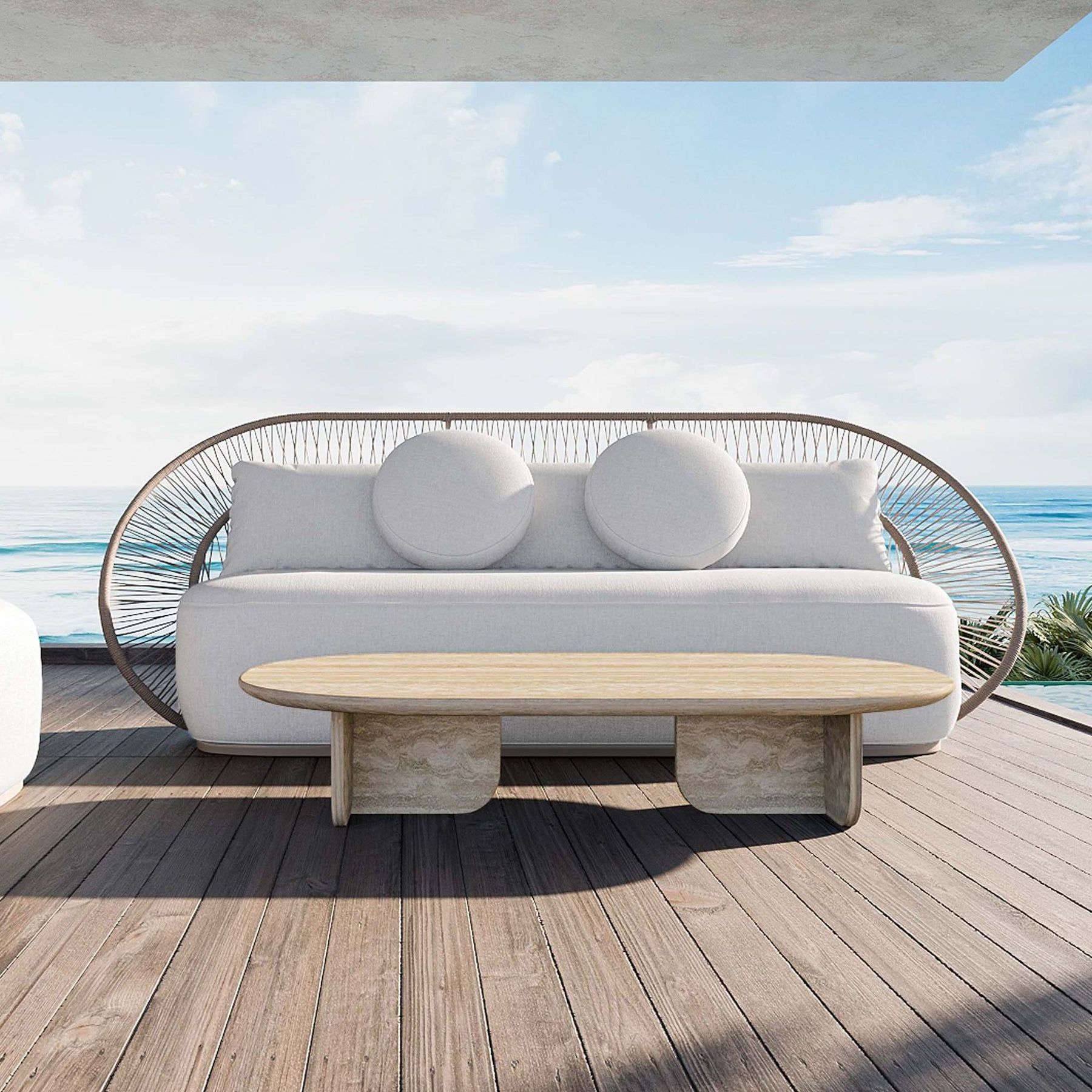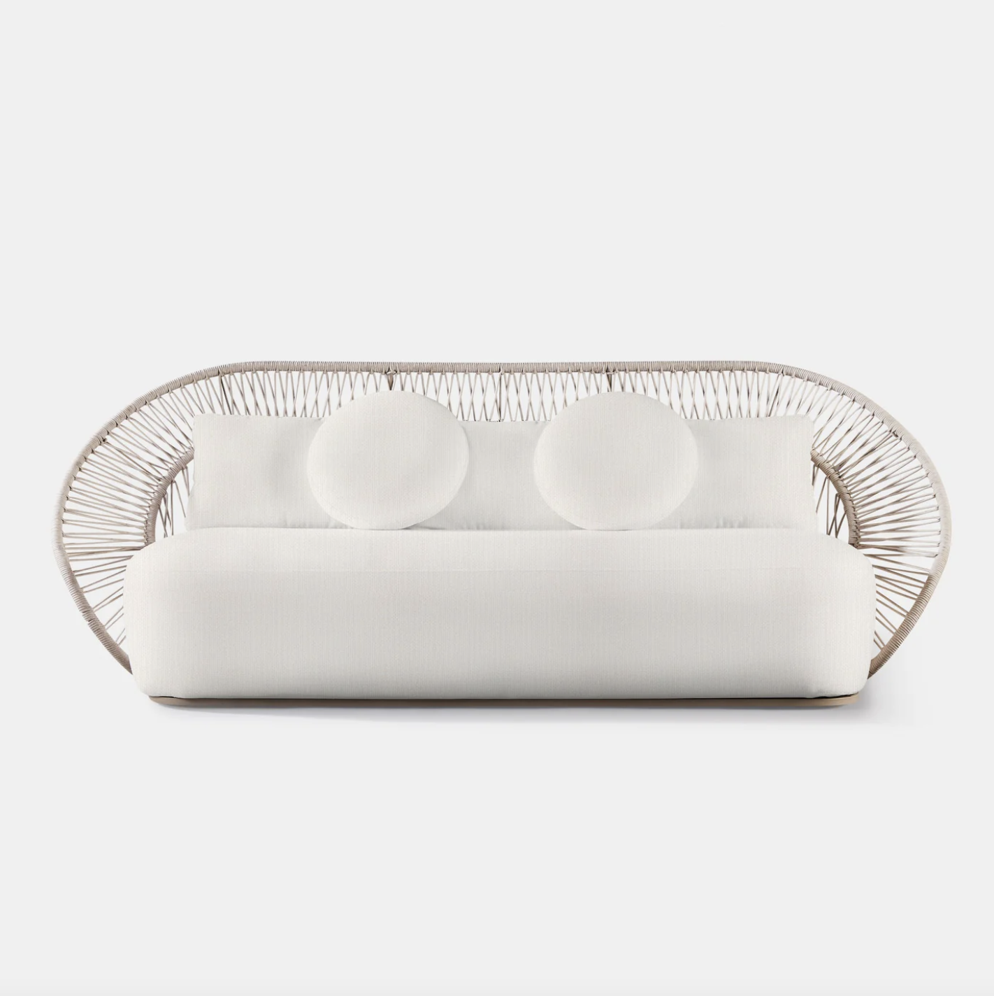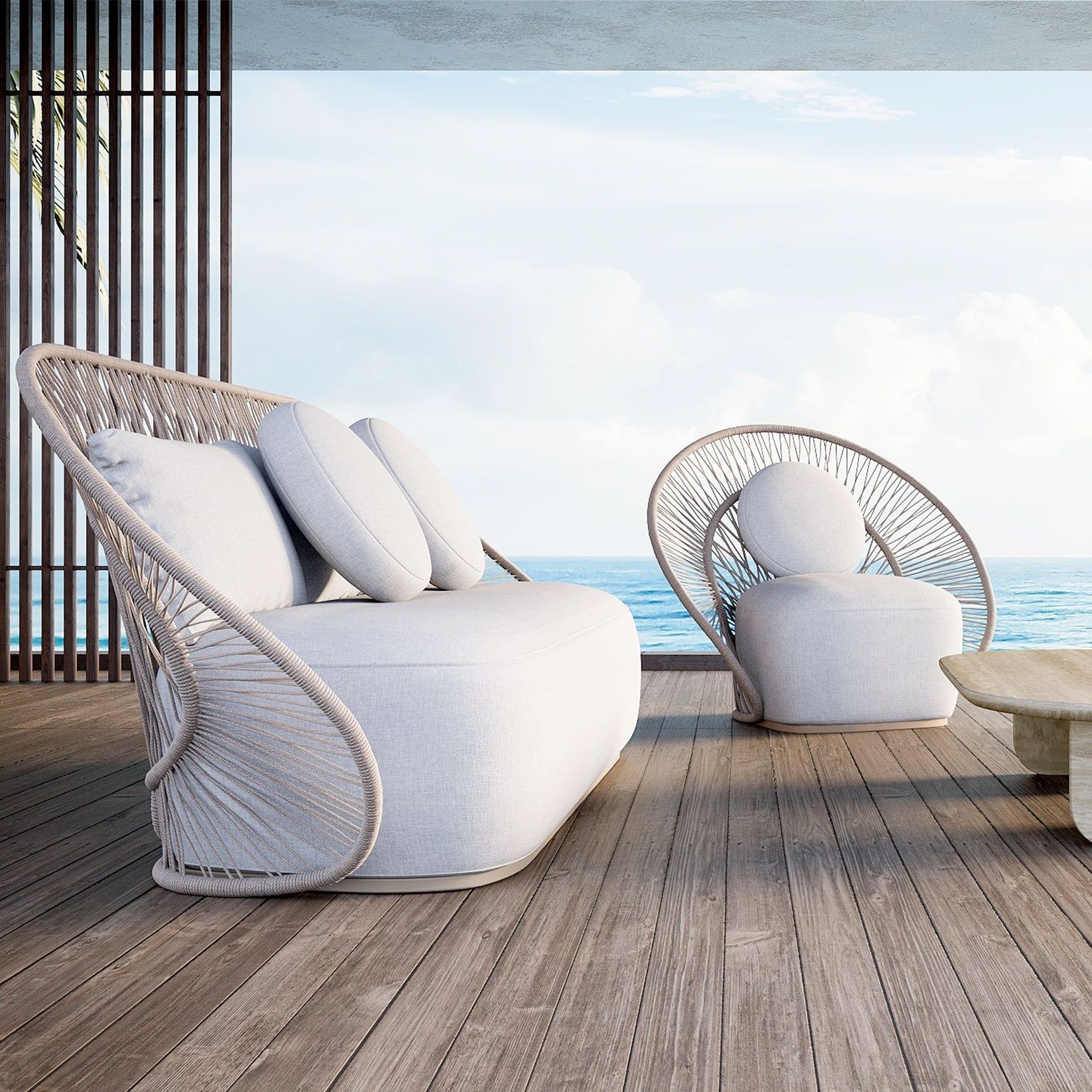 Designed by Marcel Wanders Studio. Featuring a signature radial rope pattern that creates a sophisticated rhythm, our Maui collection is nomadic luxury. Inspired by the rounded forms of a wide-brimmed straw hat, the Maui Lounge Chair is the grounding element to your space — enjoy a generous seat cushion with a multi-dimensional rounded back hand woven from all-weather taupe rope, all on a sliver of an aluminum plinth base. A casual mix of round and rectangular back pillows completes the aesthetic. Refined and yet Bohemian, this conversation piece amplifies any space.