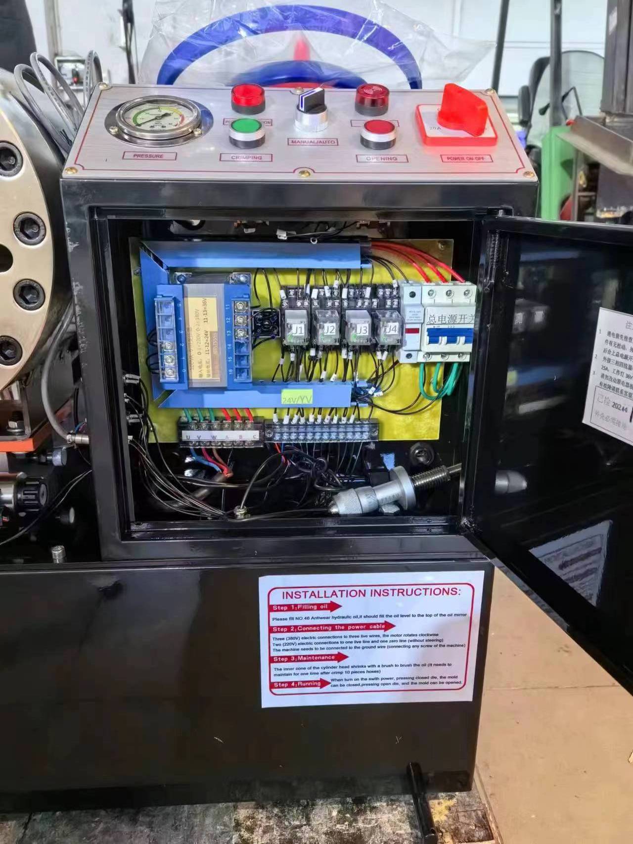 This is the crimping machine used for press hydraulic hose range 1/4-2" 6-51mm 1-4 steel wires,or other pipe OD range 4-80mm. The machine has automatic control, including 10 sets dies, 3KW/4kw motor power, with dies locker and holder, matched move wheels and working light, very convenient and portable.