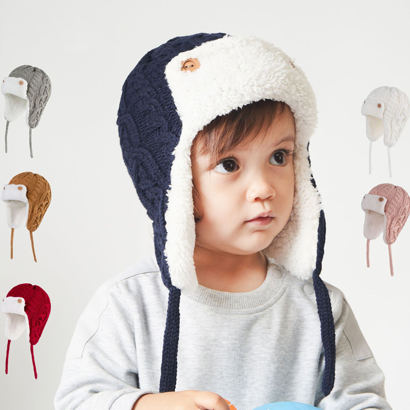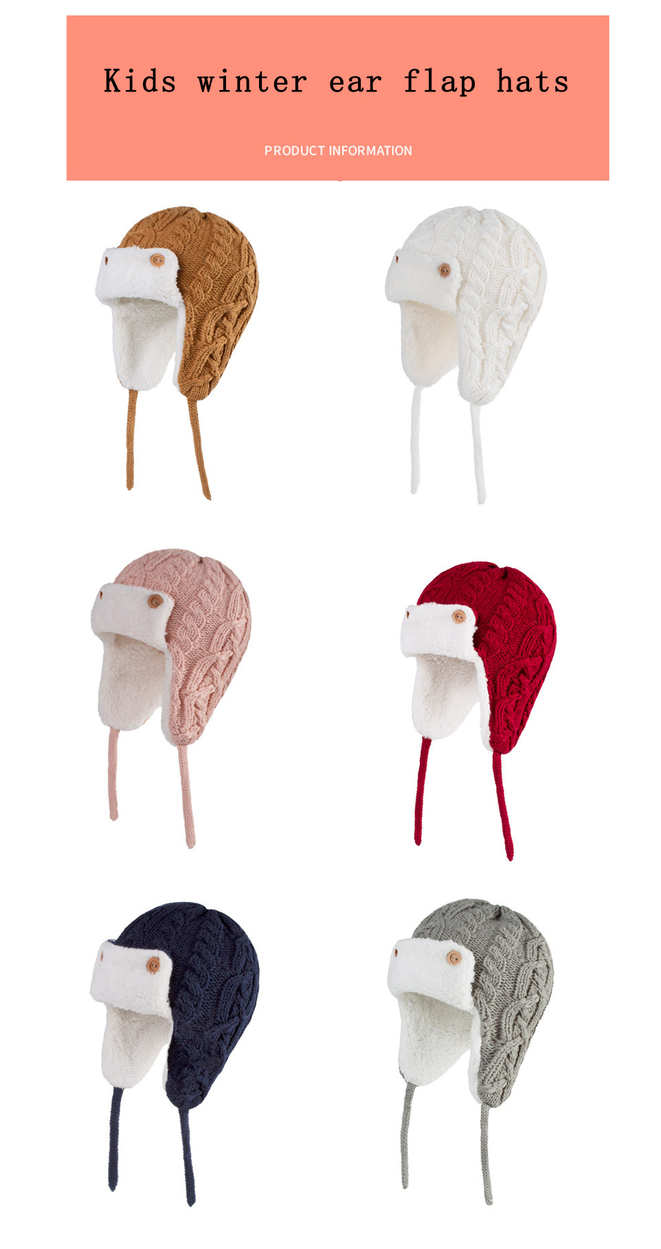 New design baby kids ear flap winter knitted hats solid color children helmet hats with fleece