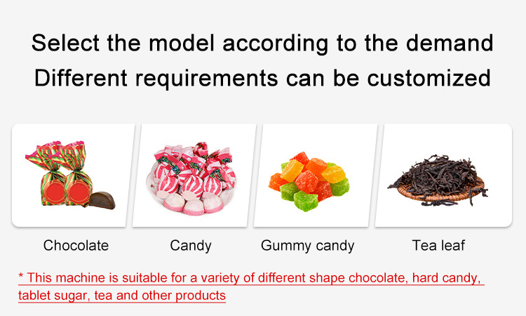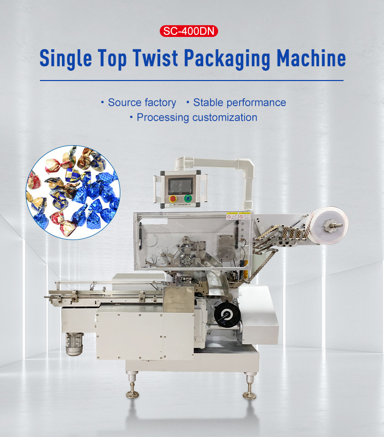 1. The machine is designed for allocating, feeding, and packing irregular shaped chocolates/hard candies/pressed sugar/tea automatically. It adopts the packing form of folding on the bottom and twisting on the top. SC-400DN ensures the packaging fits tightly and folding angels seem symmetrical and clear.