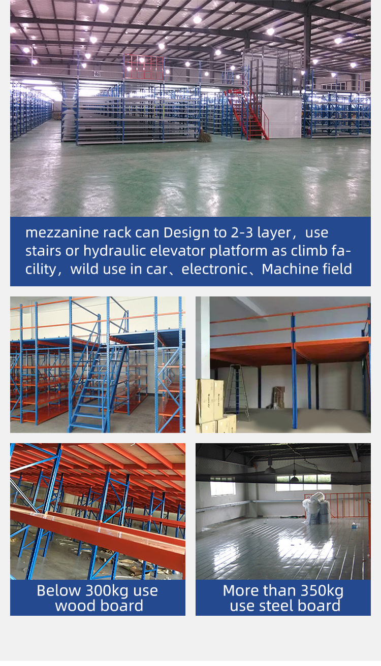 1. mezzanine rack can Design to 2-3 layer,use stairs or hydraulic elevator platform as climb facility,wild use in car、electronic 、Machine field .