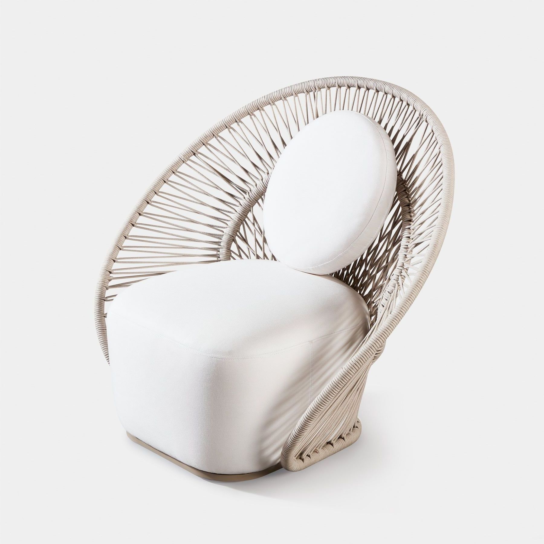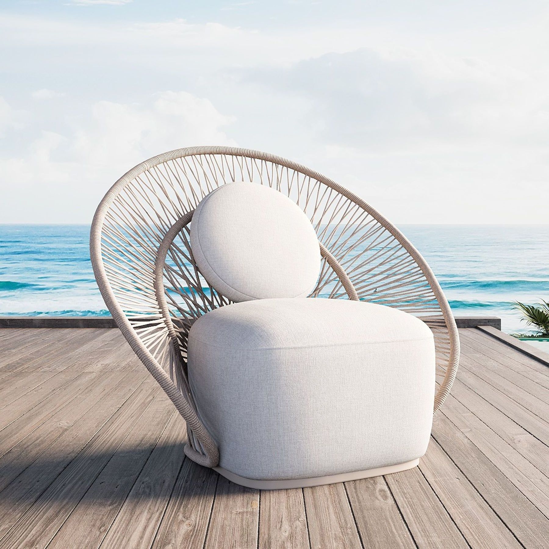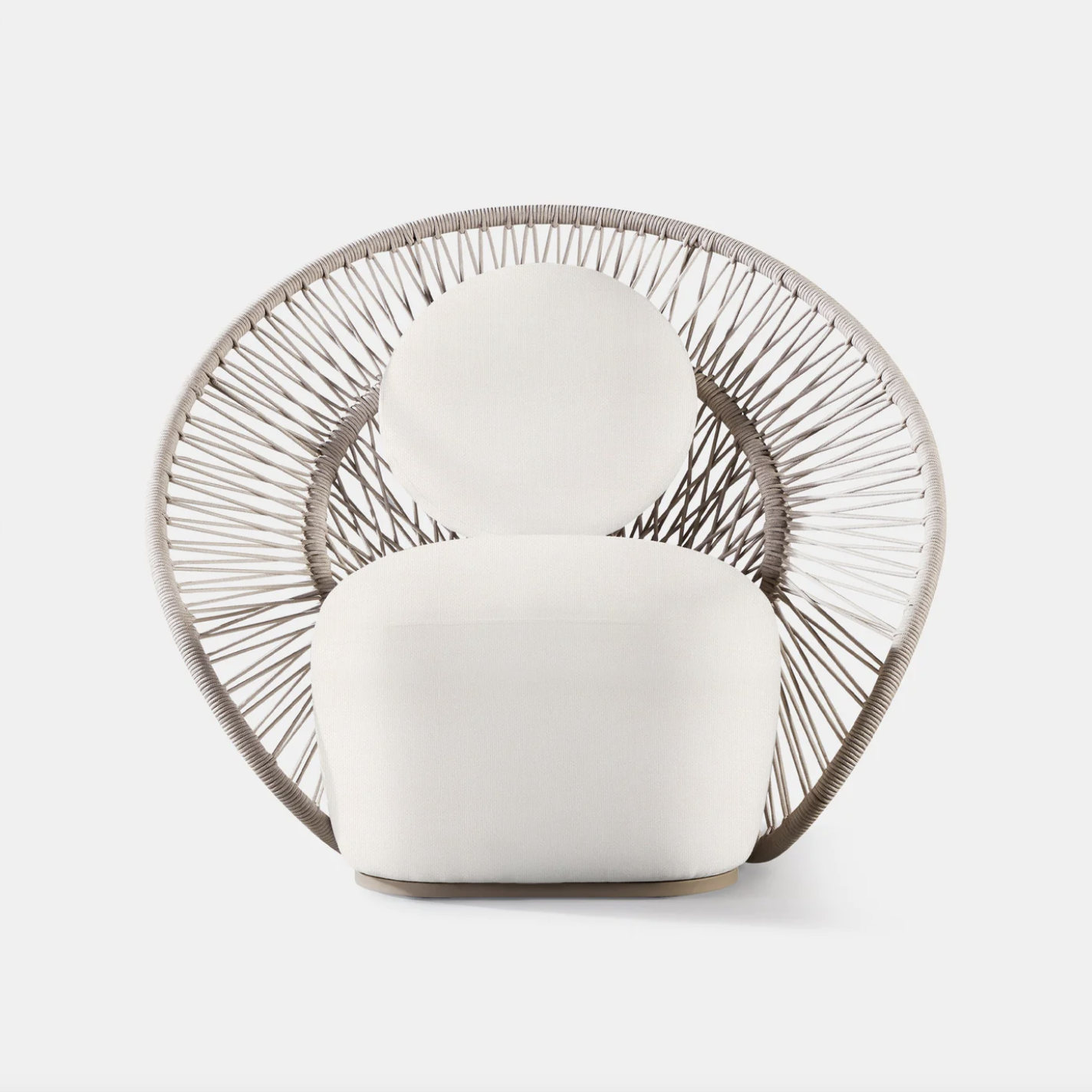 Designed by Marcel Wanders Studio. Featuring a signature radial rope pattern that creates a sophisticated rhythm, our Maui collection is nomadic luxury. Inspired by the rounded forms of a wide-brimmed straw hat, the Maui Lounge Chair is the grounding element to your space — enjoy a generous seat cushion with a multi-dimensional rounded back hand woven from all-weather taupe rope, all on a sliver of an aluminum plinth base. A casual mix of round and rectangular back pillows completes the aesthetic. Refined and yet Bohemian, this conversation piece amplifies any space.