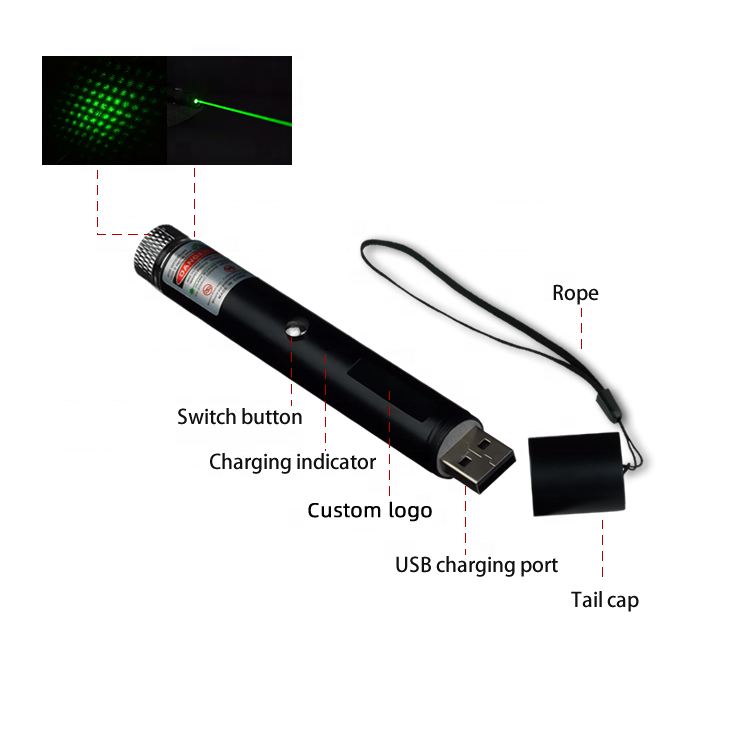 1. The price of our USB rechargeable portable laser pointer is a set of green (laser pointer + 4 star caps + color box), and the body has 5 colors: black, blue, yellow, red and pink. By default, we will send out a green black body (need to order a red indicator light), so if you buy other colors, please contact customer service and purchase as needed.