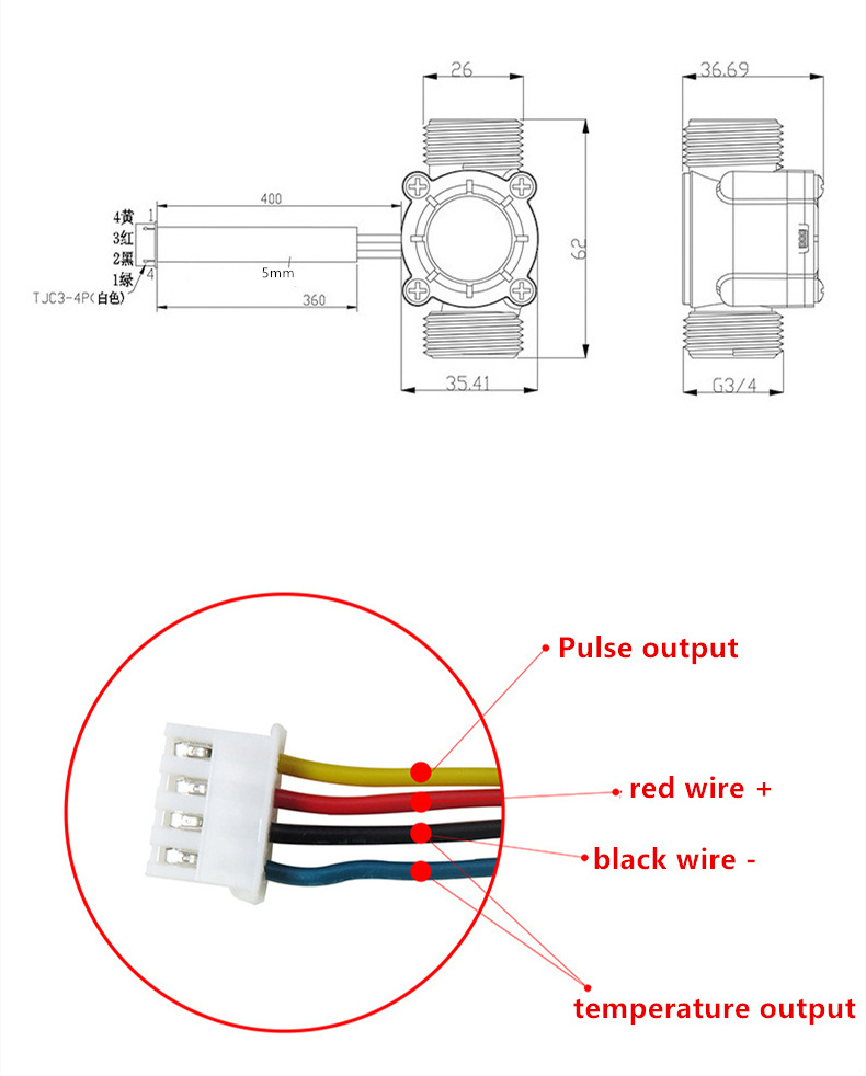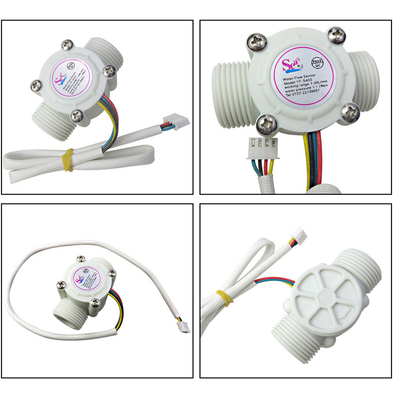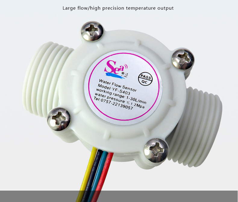 3/4 inch Water flow sensor YF-S403 is mainly consists of plastic valve body, rotor assembly and hall current sensor. This flow sensor can be used for accurate flow measurement. It is installed in the hot water inlet end for detecting water flow. When water through the flow rotor assembly, magnetic rotor will rotate and Speed will change as the flow change. Hall current sensor output corresponding pulse signal and feedback to controller, then the controller will control the flow. Can be used for water heaters, credit card machines, water vending machine, flow measurement device.