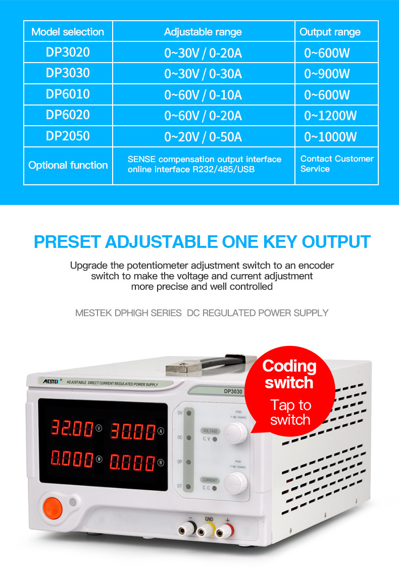 Three-digit display: voltage 0.1V, current 0.1A