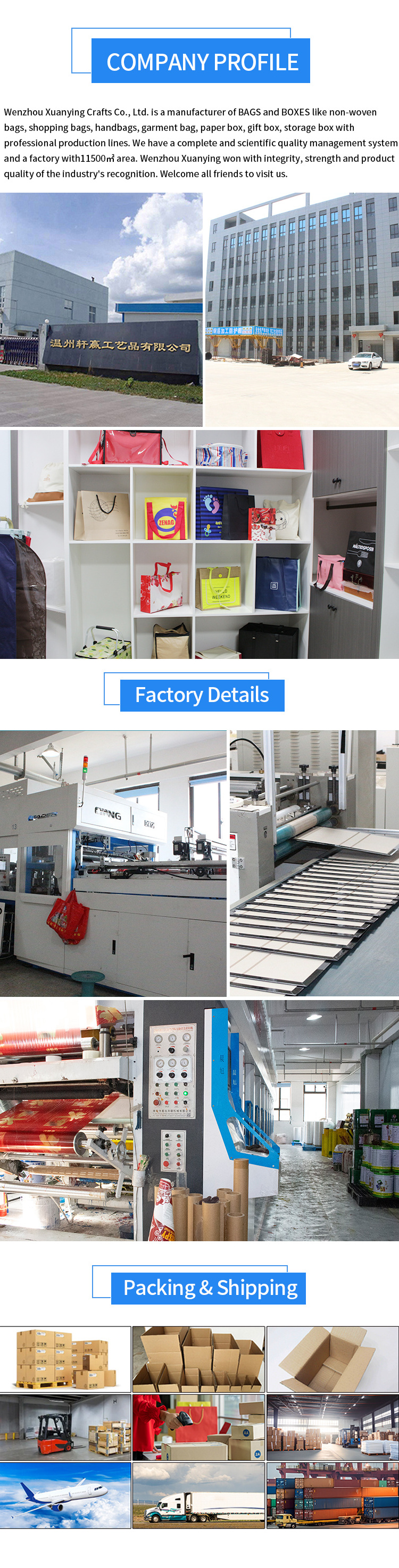 We are manufacturer of bags boxes etc with over 15 years’ experience. We have two factories cover 115000㎡.