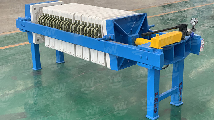 Manual Hydraulic Chamber Filter Press consists of a hydraulic pump and a piston. Installing the filter plate and filter cloth in sequence, turn the one-way valve clockwise, press the handle up and down, and the piston rod presses the filter plate until the pointer of the pressure gauge reaches the maximum. Simplified structure, small size, easy to move. Easy to operate, and strong versatility. No need power supply, economy. It is mainly used for small scale enterprises and laboratories with less filtration materials.