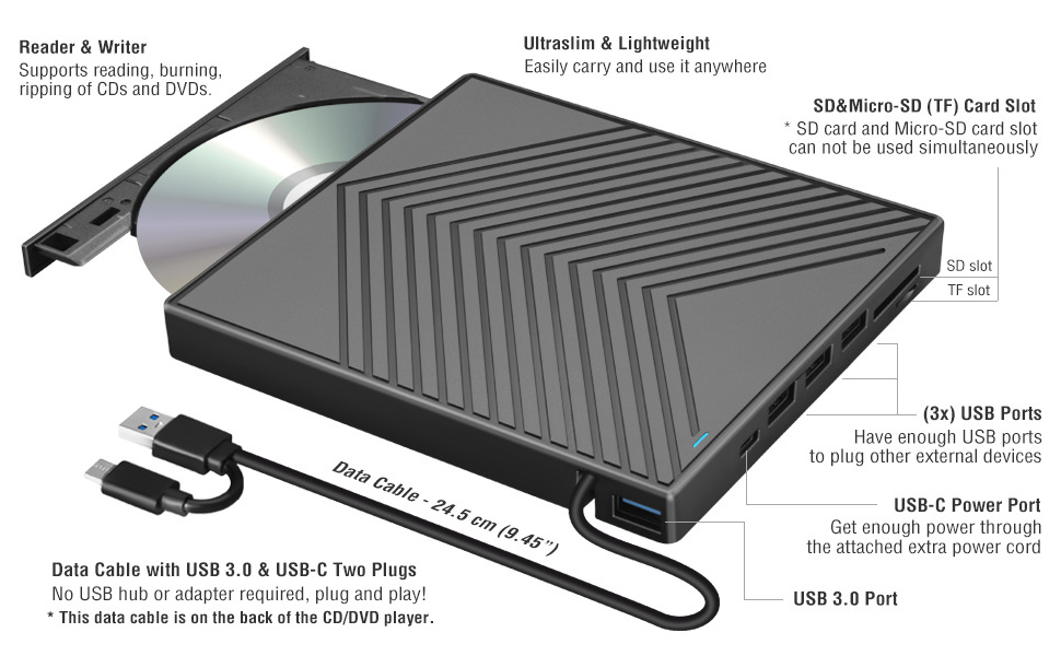 This optical drive solves the problem of few computer interfaces: the optical drive has one usb3.0, three usb2.0, one SD card slot, and one TF card slot. The integrated design makes your work and life more convenient.